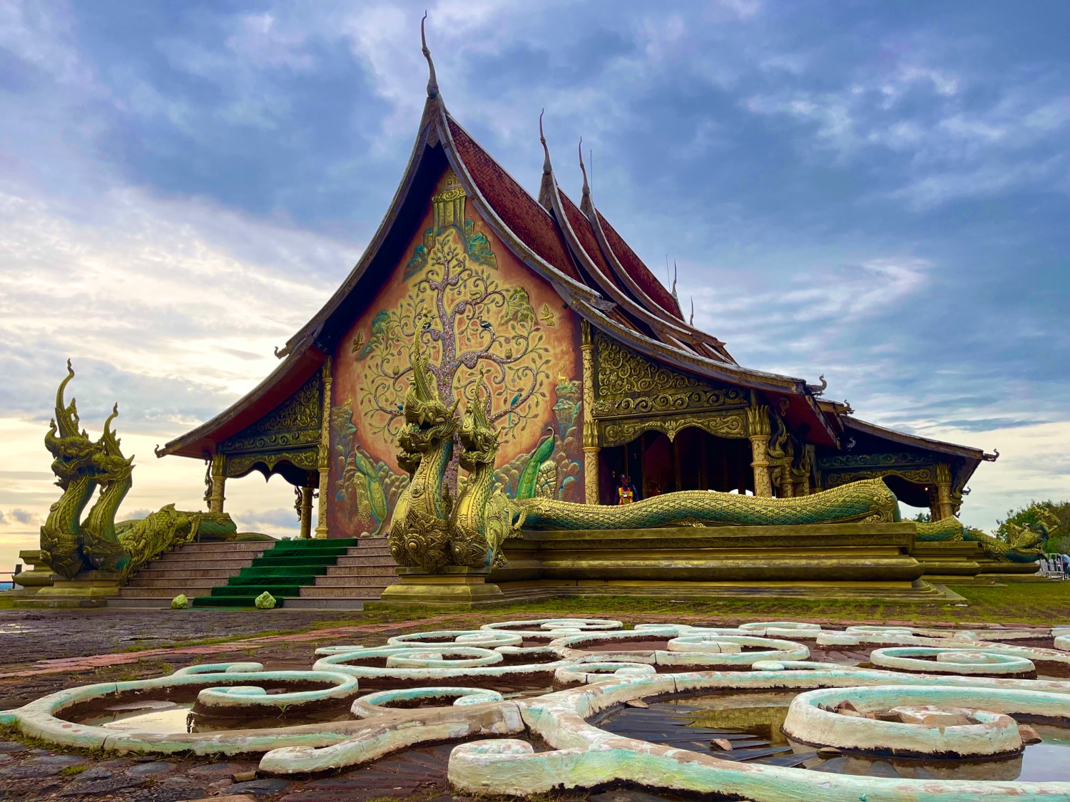 หลังจากอิ่มเอมกับวิวแล้วเราเดินมายัง วัดสิรินธรวรารามภูพร้าวซึ่งเป็นวัดที่สร้างขึ้นใหม่ โดยใช้แบบจากวัดเชียงทอง ในประเทศลาว แต่มีขนาดที่ขยายใหญ่กว่า ทางเดินเข้าวัดที่นี้เป็นลวดลาย คาแรคเตอร์ต่างๆ ร่วมสมัย คงตั้งใจทำขึ้นเพื่อดึงดูดเด็กให้สนใจในวัดมากขึ้น
