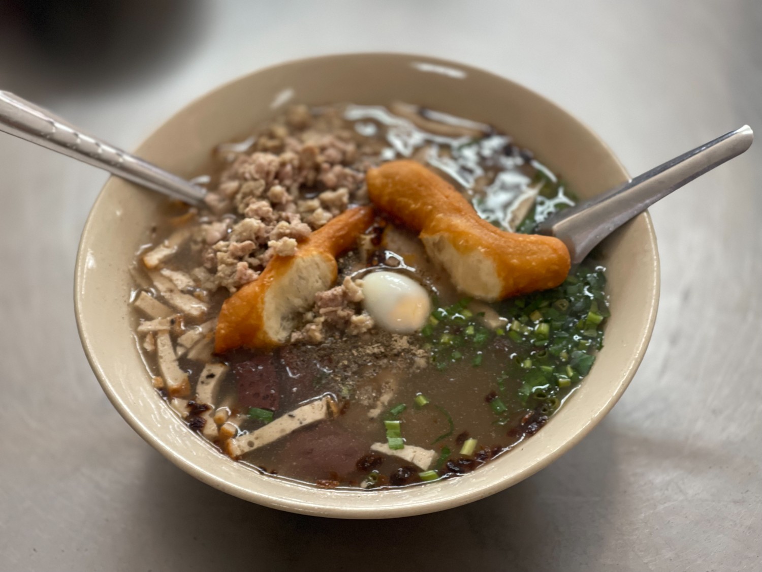 ตื่นแต่เช้า หลังจากพักผ่อนอย่างเต็มที่ เรามาที่ร้าน ก๋วยจั๊บตาหมี ที่ขายมาตั้งแต่รุ่นพ่อจนปัจจุบันกลายมาเป็นลูกชายมาขายแทนแล้ว ก๋วยจั๊บญวน กินกับปาท่องโก๋ ในยามเช้า ช่างสบายท้องจริงๆ