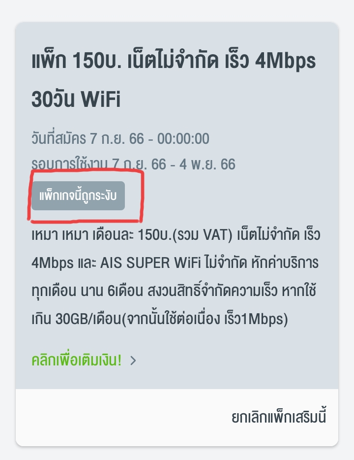 อยากสมัคแพ็ก150บ. เน็ต100GB(เร็ว4Mbps) โทรฟรี Wifi 6เดือนครับ พอดีผมไม่ได้ใช้เบอร์นี้นาน ไม่ได้เติมเงินเข้าเลย พอมาดูอีกที แพ็กเกจก็หมดแล้ว เลยอยากใช้งานต่อ
