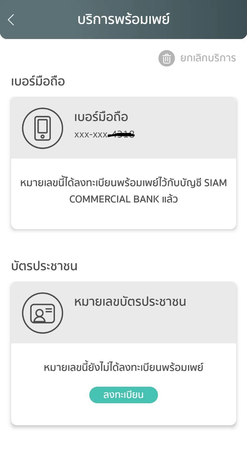 ทำไมพร้อมเพย์ลงทะเบียนเบอร์โทรศัพท์ไม่ได้คะมันเขียนว่าลงทะเบียนพร้อมเพย์ไว้กับธนาคารไทยพาณิชย์แต่เรายังไม่เคยลงเลยค่ะ