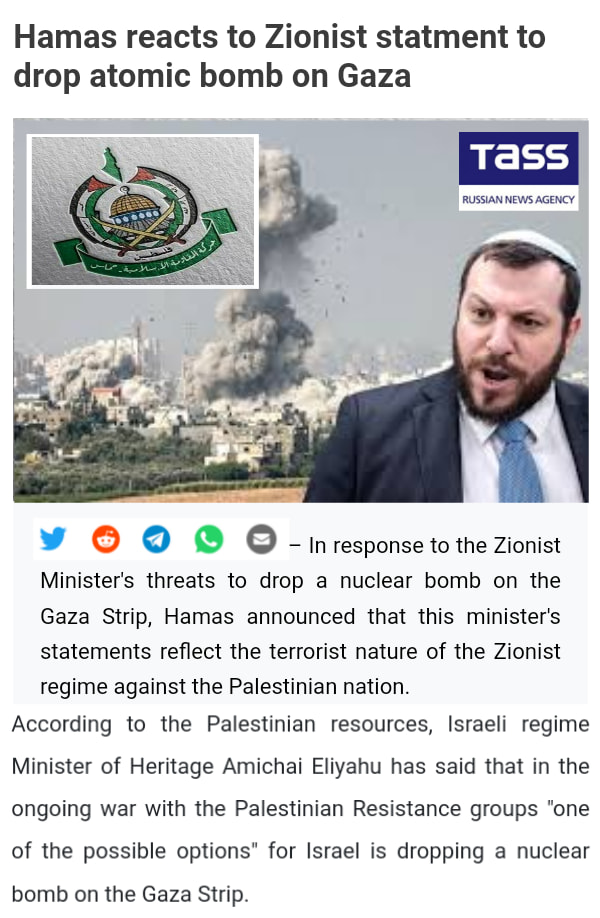 The Israel Hayom newspaper reported earlier that Israeli Heritage Minister Amichai Eliyahu has suggested that Israel stops sacrificing its soldiers for the sake of releasing Hamas-held hostages but drop a nuclear bomb on Gaza instead.