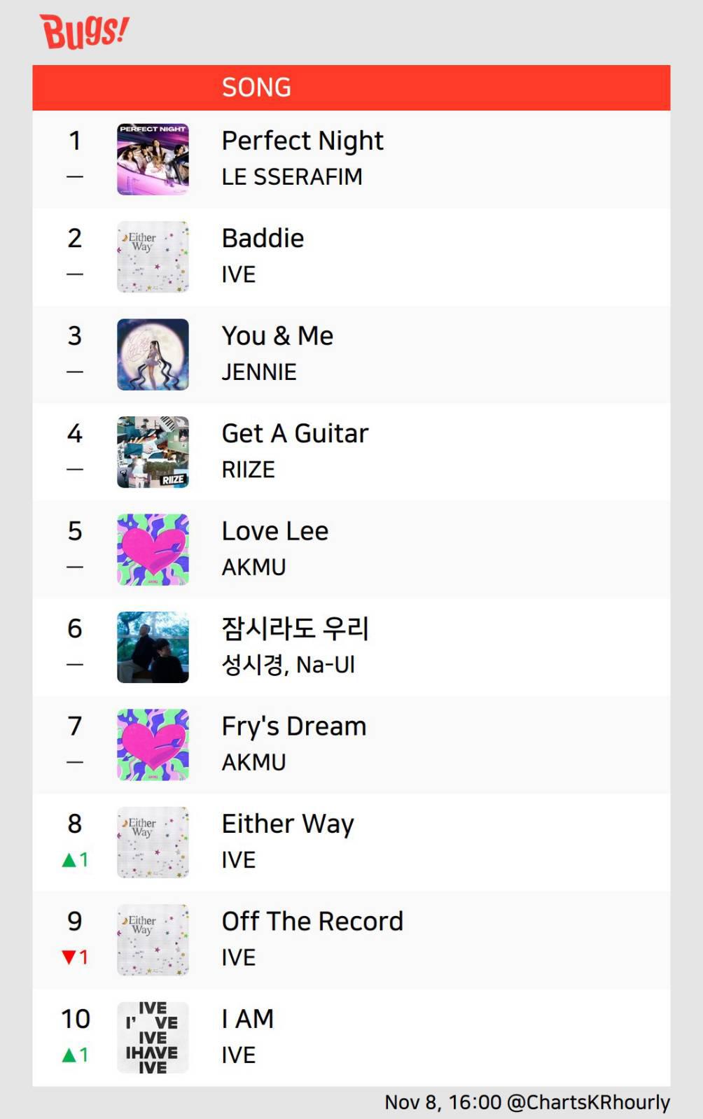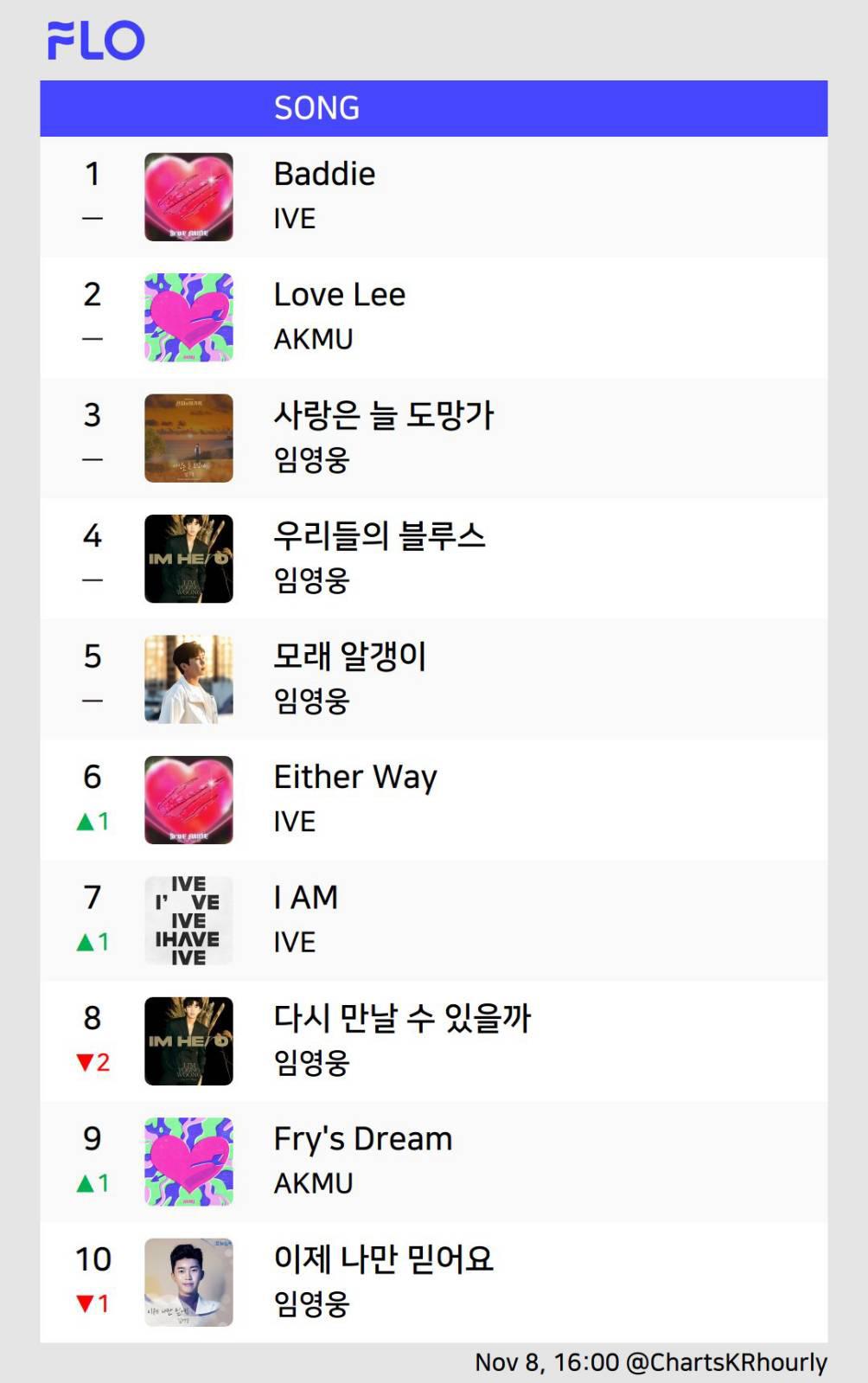 IVE 'Rebel Heart' 10PM KST: #1 Bugs (=) #1 FLO (+1) *new peak* #5 Genie (-1) #5 MelOn (=) MelOn ULs: 162,864 (+300) *new p
