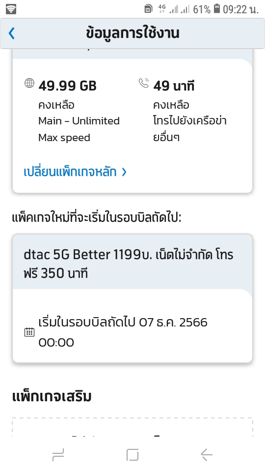 น้องใจดีตรวจสอบแพ็คเกจที่สอบถามคือ 5G Better+ 1,199 บาท/เดือน ซึ่งจะเริ่มใช้งานในรอบบิลถัดไป วันที่ 07/12/2023 ครับ