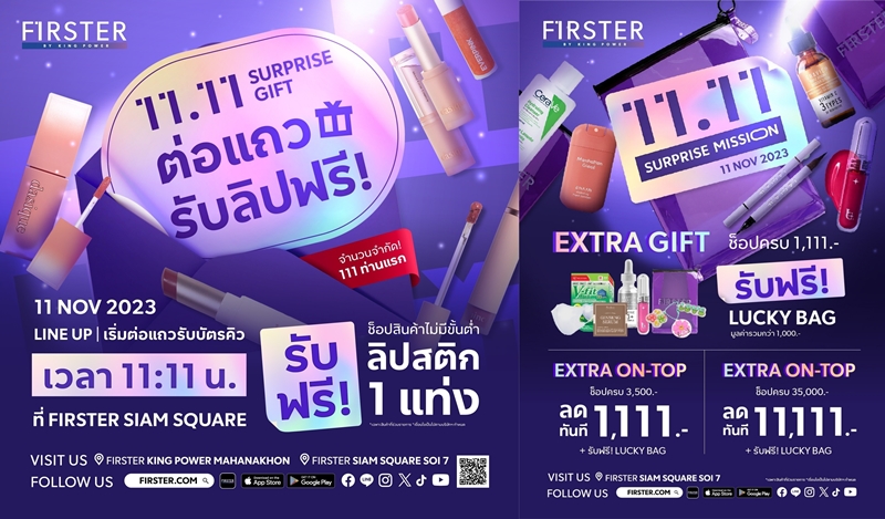 พร้อมชวนพบกับโปรโมชั่นดีลแรงแห่งปีตลอดเดือน 11.11 และกิจกรรมอีกมากมาย ที่ FIRSTER BY KING POWER
