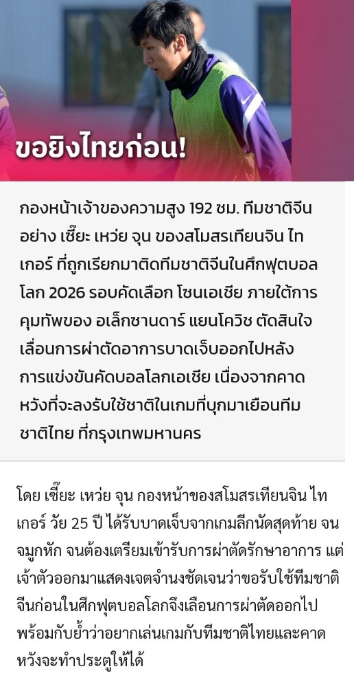 กองหน้าอันตรายจีน จมูกหัก เลื่อนผ่า ขอยิงไทยก่อน
