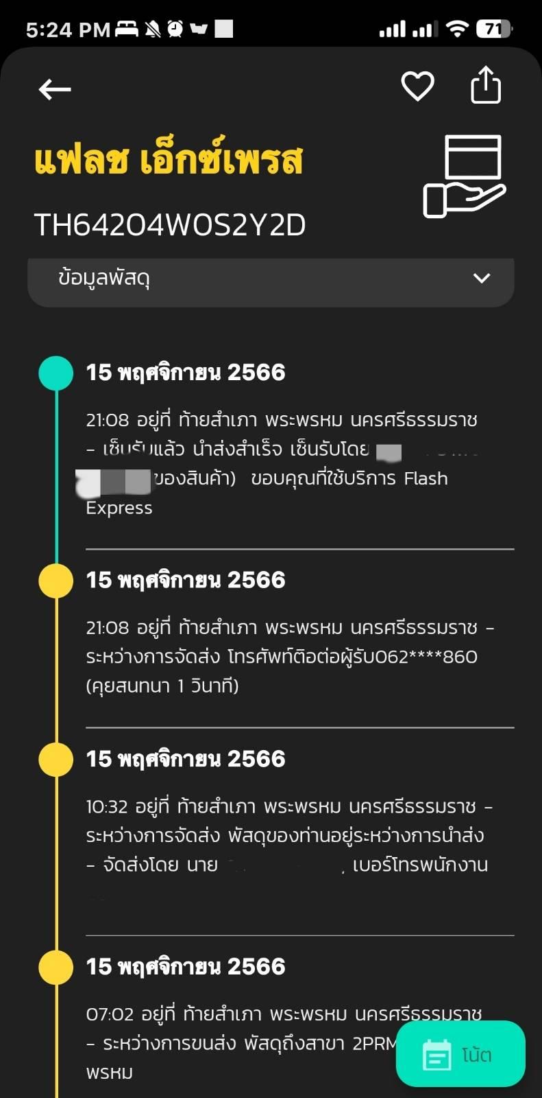 คือของถึงมาเมื่อวันที่ 15 นี้นั่งรอของทั้งวันเลยสรุปไม่มาส่งพอประมาณ 21.08น. ขึ้นโทรหาและส่งของสำเร็จในระบบ ซึ่งทางผู้รับไม่ได้รับเองแต่อย่างไร โทรหาคนที่ส่งไม่รับแถมยังตัดสายทิ้ง โทรหาสาขาไม่มีคนรับ โทรศูนย์ใหญ่ไม่มีอะไรคืบหน้า แถมชองด้านในยังเป็นเอกสารราชการสำคัญส่ะด้วยเราควรทำยังไงดี🥹