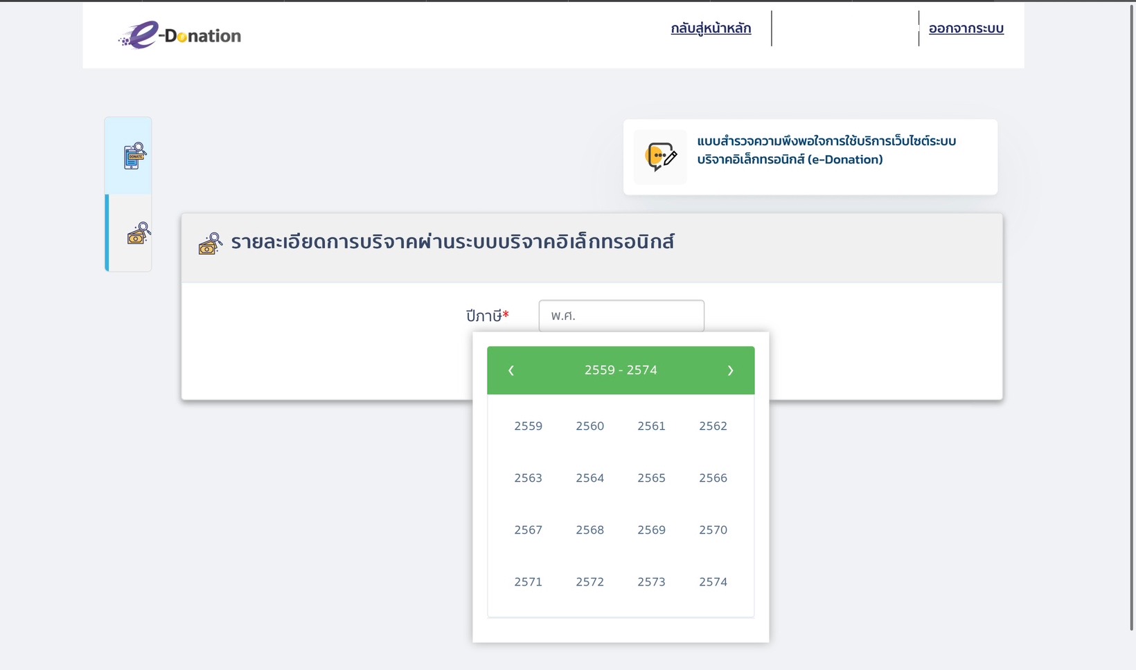 หลังจากเข้าสู่ระบบ จะเข้ามาที่หน้านี้ สามารถเลือกปีที่เราต้องการดูยอดเงินบริจาคได้เลยครับ