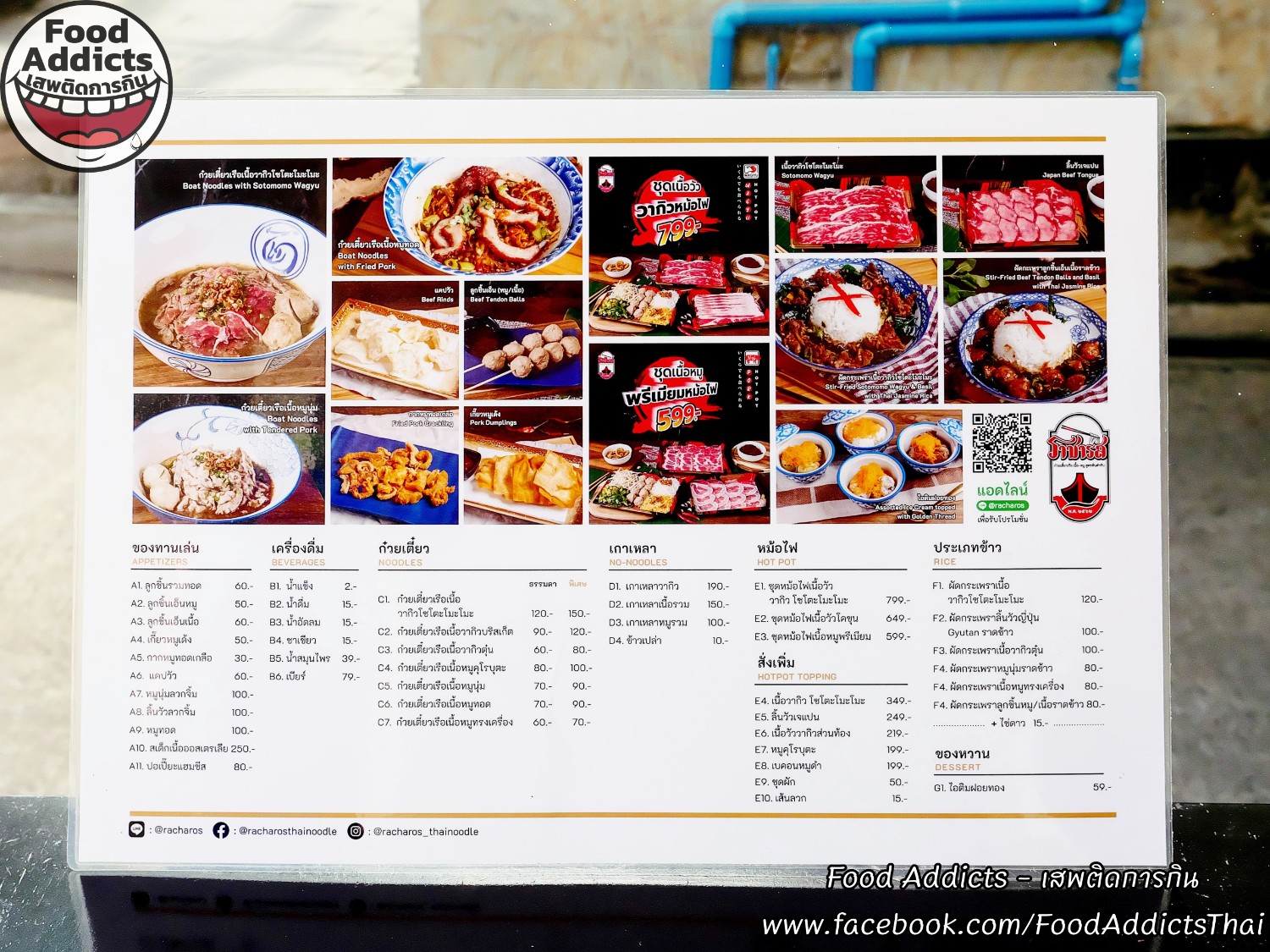 วิธีการออเดอร์ชมจากรีวิวเก่าเมื่อก่อนทางร้าน "ราชารส" ต้องเขียนบนแผ่นกระดาษโดยเราสามารถเลือกเมนูจานหลัก,ชนิดของเส้นก๋วยเตี๋ยว,ระดับความเผ็ด,ช่องหมายเหตุระบุได้ว่าไม่ผักบุ้งหรือถั่วงอกตามใจแต่ปัจจุบันปรับเปลี่ยนสู่ระบบออนไลน์ใหม่เพียงเปิดมือถือกดสแกน QR Code ส่งตรงถึงห้องครัวข้างหลังบ้านทันทีสะดวกรวดเร็วทันใจมากยิ่งขึ้น สำหรับรายการแรกนั้นอยู่ในหมวด "ก๋วยเตี๋ยวเรือหม้อไฟ" ซึ่งเป็น Signature อีกอย่างห้ามพลาดเด็ดขาดมีจุดเด่นอยู่ที่น้ำซุปกระดูกชนิดเข้มข้นพิเศษปรุงรสชาติเปรี้ยวเผ็ดอมหวานพอกลมกล่อมนัวกะทิหอมเครื่องสมุนไพรไทยแทรกซึมเข้าถึงวัตถุดิบสไลซ์แผ่นบางลวกใช้เวลาไม่นานนักก็พร้อมรับประทานทันทีแบบไม่ต้องเรียกหาน้ำจิ้มเพิ่มเติมอีก ส่วนเนื้อสัตว์ชนิดต่างๆเจ้าของแบรนด์คัดสรรเฉพาะคุณภาพระดับ Premium จำกัดเพียง 1 ถาดต่อท่านเท่านั้นได้แก่ "โชโตะโมะโมะ" บริเวณระหว่างสะโพกกับน่องวัวแทรกชั้นไขมันสวยงามละเอียดเหมือนลายหินอ่อนสัมผัสค่อนข้างสู้ฟันกลิ่นเด่นชัดชาวญี่ปุ่นมักจะนำไปกินสไตล์สุกี้ยากี้น้ำดำ / "วากิวส่วนท้อง" อีกชื่อเรียกนั่นก็คือบริสเก็ตลักษณะภายนอกคล้ายสามชั้นไขมันสีขาวสลับเนื้อสีแดงนุ่มนิ่มแทบละลายในปากไหลลื่นลงคอชวนฝัน / "ลิ้นวัวเจแปน" เกรดนำเข้าจากฟาร์มมาตรฐานสูงแห่งดินแดนอาทิตย์อุทัยเคี้ยวกรุบกรอบเด้งสนุกเพลิดเพลินดีครับ