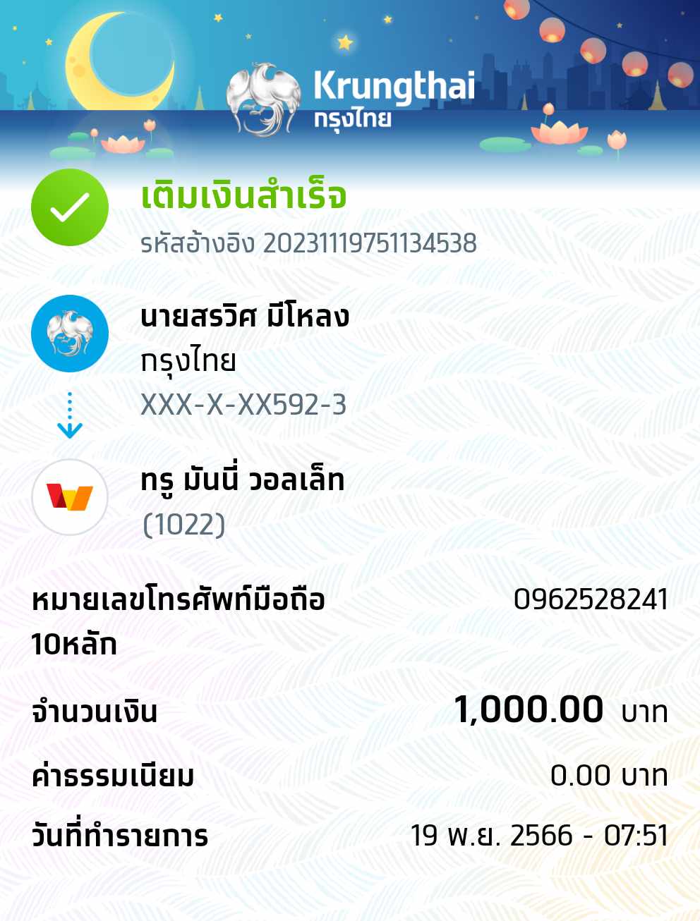 เติมเงิน true wallet ผ่านแอพ กรงไทย 120บาท แต่เงินไม่ เข้า true wallet