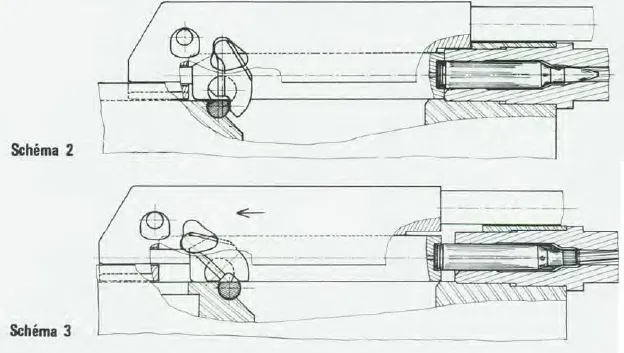 ระบบการทำงานจะประกอบไปด้วย 3 ส่วน คือ หัวลูกเลื่อน โครงนำลูกเลื่อน เเละคานขัดกลอน โดยที่หัวลูกเลื่อนอยู่ภายใน โดยมีแกนคานขัดกลอนเป็นตัวยึดโยงกันกับโครงนำลูกเลื่อน เมื่อทำการยิงแรงดันในรังเพลิงจะกระทำกับหน้าลูกเลื่อน ด้วยมวลที่ต่างกันระหว่างหัวลูกเลื่อนและโครงนำลูกเลื่อน ตัวโครงนำลูกเลื่อนจะเริ่มถอยหลังไปบังคับให้คานขัดกลอนล้มตัวลงให้แง่ล่างพ้นกับการขัดกับโครงปืน หัวลูกเลื่อนจึงถอยหลังรั้งปลอกกระสุนออกมา
