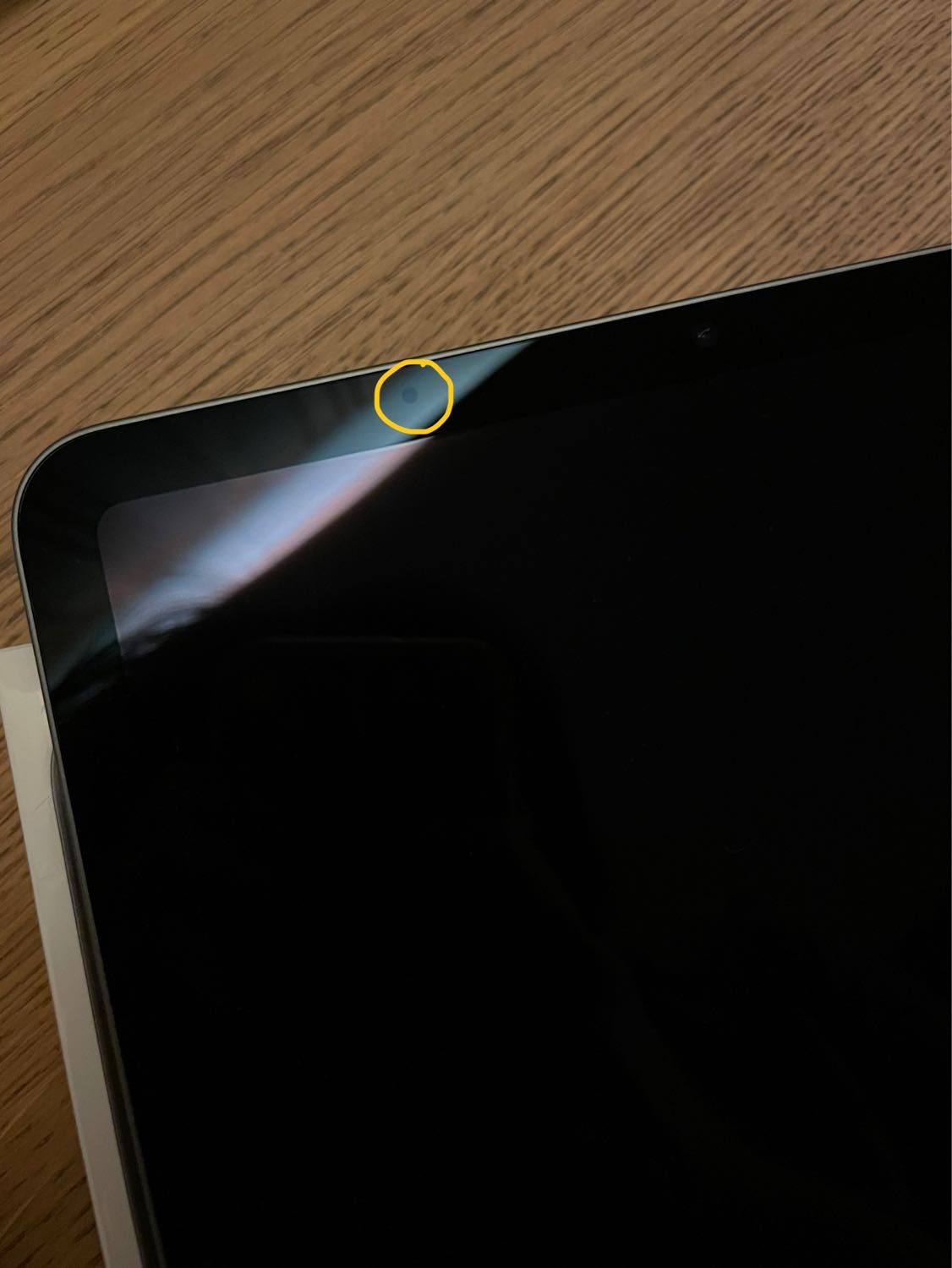 เราใช้ไอแพดแอร์ 4 ค่ะ วันนี้ตอนอ่านหนังสือเหลือบไปเห็นจุดเล็กๆบนจอ ทีแรกก็คิดว่าฝุ่น แต่ดันเช็ดออกไม่ได้ เลยลองถอดฟิล์มดู สรุปมันไม่ใช่ฝุ่นอ่าค่ะ ตอนซื้อมา เครื่องไม่มีตำหนิเลยค่ะ แต่มาวันนี้มันมีจุดเ