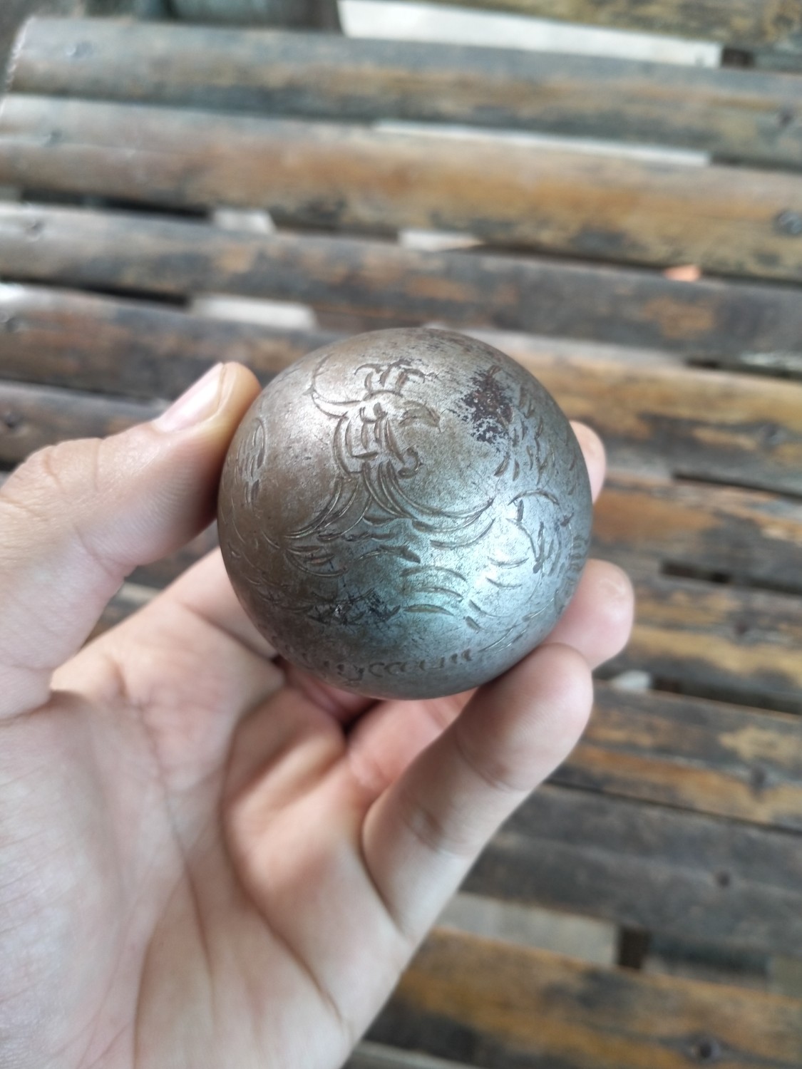 ลูกเหล็ก ข้างในมีอะไรไม่รู้ แกรเป็นรอยนกยูง 2 หาง