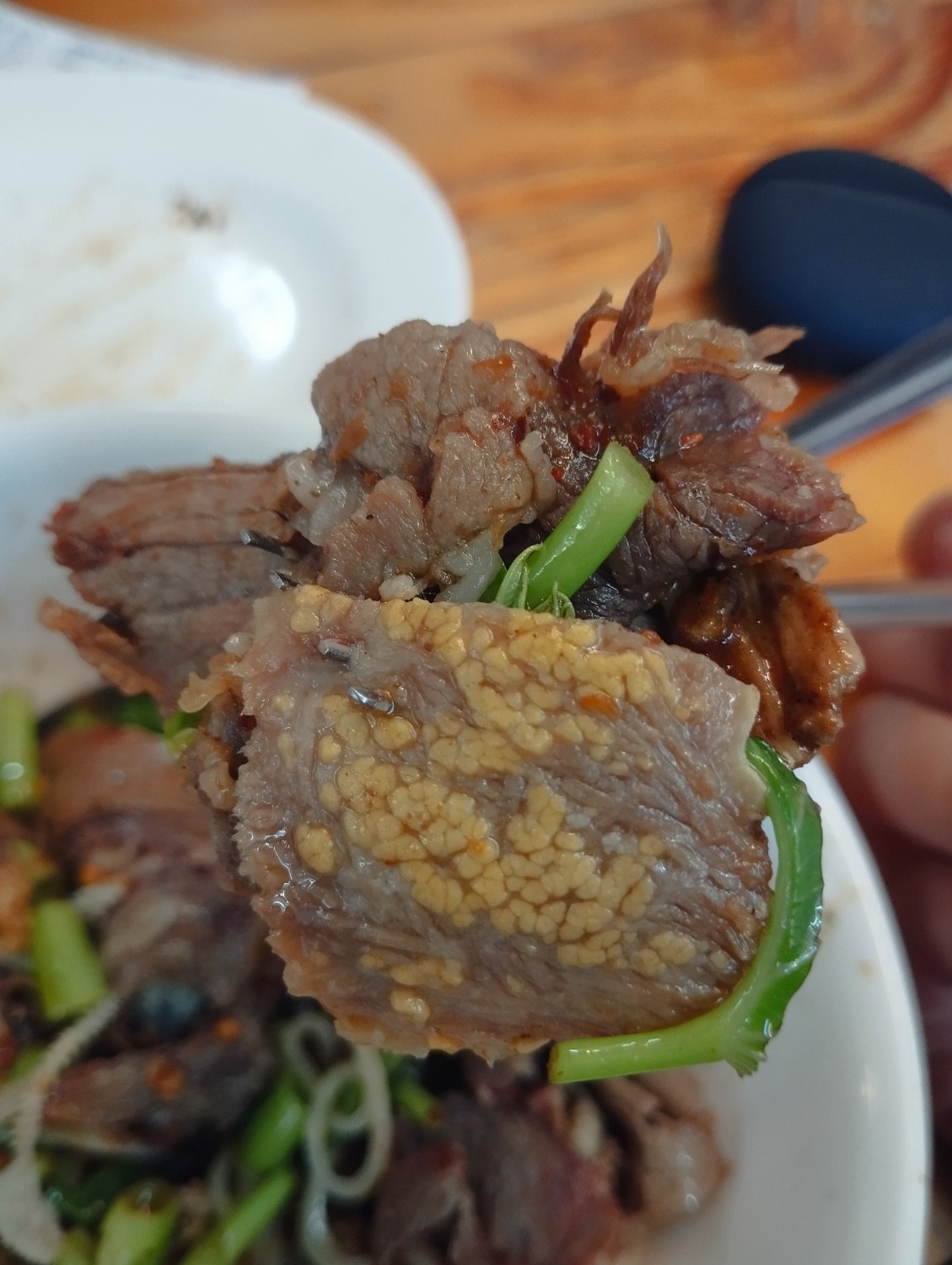 พอดีผมไปกินเตี๋ยวเนื้อแล้ว ตักเนื่อขึ้นมาแล้วเป็นแบบนี้ พี่ๆคนไหนพอรู้ไหมครับ ว่าเกิดจากอะไร