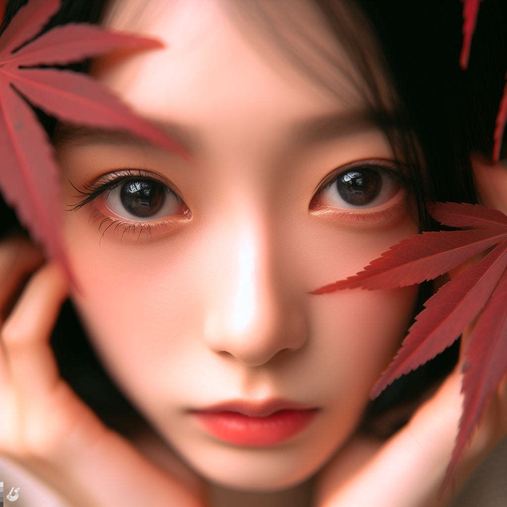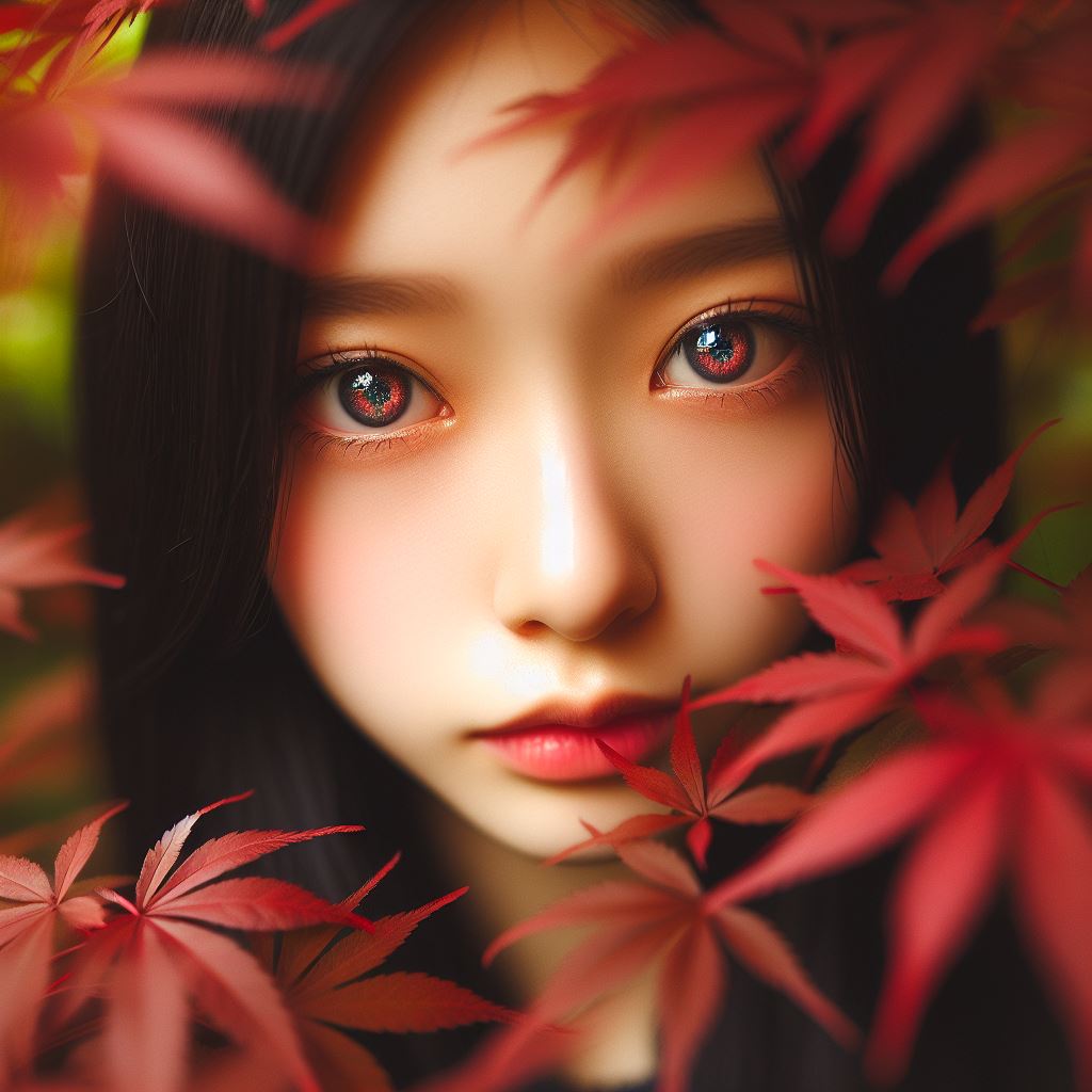 [ภาพถ่ายโฟกัสสวยตาหญิงสาวผ่านช่องว่างระหว่างใบเมเปิ้ลญี่ปุ่น,F1.5,สาวตาเหมือนคนเศร้า,ภาพมีมิติพิศวง]