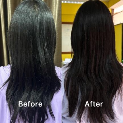 พอผ่านไป 2 เดือน ผมไม่ร่วงและผมดกขึ้นเยอะมาก ถ้าสังเกตจากรูปจะเห็นว่าก่อนใช้ ผมเราเริ่มบางจนมองเห็นหนังศรีษะ แต่พอใช้ไปได้ 2 เดือน ผมขึ้นหนา และดำเงา ไม่ชี้ฟูด้วย