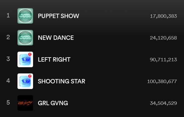 🍝 'SPAGHETTI (ft. j-hope)' on Spotify Counter (12.05) Day 38: 1,692,923Day 39: 1,509,310*Day 40: 1,765,275 Day 41: 1,699,589 Day 42: 1,669,645Day 43: 1,678,477 (+8,832) Total: 93,197,832 #LE_SSERAFIM