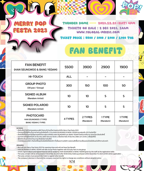 สำหรับงาน MERRY POP FESTA 2023 ทางผู้จัด YGLOBAL อยากให้เป็นคอนเสิร์ตที่แฟนๆ ชาวไทยของทั้ง 3 ศิลปินมาร่วมร้อง ร่วมเชียร์ และสนุกไปกับโชว์ทุกโชว์ และติดตามความพิเศษมากมายที่เหล่าศิลปินเตรียมขนมามอบให้กับแฟนๆ ทุกคน และไม่ใช่แค่ผู้จัด ทั้ง 3 ศิลปินไม่ว่าจะเป็น ฮันซึงอู, บังเยดัม และหนุ่มๆ วง บัส ทั้ง 12 คน ไม่ว่าจะเป็น อลัน-พศวีร์ ศรีอรุโณทัย, มาร์ค-กฤษณ์ กัญจนาทิพย์, ขุนพล-ปองพล ปัญญามิตร, ฮาร์ท-ชุติวัฒน์ จันเคน, จินวุค คิม, ไทย-ชญานนท์ ภาคฐิน, เน็กซ์-ณัฐกิตติ์ แช่มดารา, ภู-ธัชชัย ลิ้มปัญญากุล, คอปเปอร์-เดชาวัต พรเดชาพิพัฒ, เอเอ-อชิรกรณ์ สุวิทยะเสถียร, จั๋ง-ธีร์ บุญเสริมสุวงศ์ และ ภีม-วสุพล พรพนานุรักษ์ ก็เตรียมพร้อมที่จะมามอบความสุขผ่านโชว์ต่างๆ ภายในงานนี้ให้กับแฟนๆ ชาวไทยทุกคนเป็นพิเศษเพื่อเป็นของขวัญในวันคริสมาสต์ปีนี้ให้กับแฟนๆ ชาวไทยทุกคนเช่นกัน บอกเลยว่าแฟนๆ ของทั้ง 3 ศิลปินไม่ควรพลาดเด็ดขาด ผู้จัดเตรียมความพิเศษไว้มากมาย รวมทั้งยังเตรียมเนรมิตแสง สี เสียงแบบจัดเต็มให้สมกับช่วงเทศกาลแห่งความสุขอย่างคริสมาสต์ ดังนั้นแฟนๆ ทุกคนเตรียมตัวให้พร้อมและจับจองบัตรกันให้ทัน โดยจะเปิดขายบัตรในวันเสาร์ที่ 2 ธันวาคม 2566 ตั้งแต่เวลา 10.00 น. เป็นต้นไป ผ่านทาง www.yglobal-music.com พร้อมสิทธิพิเศษแบบปังๆ ทั้ง ไฮทัชกับบังเยดัม และฮันซึงอูอย่างใกล้ชิด, สิทธิ์สุ่มผู้โชคดีรับสิทธิ์ถ่ายภาพกับศิลปินทั้งเยดัม และซึงอู, โพลารอยด์พร้อมลายเซ็น, และโปสเตอร์พร้อมลายเซ็น รวมทั้งยังมีแจก โฟโต้การ์ดให้กับบัตรทุกราคาอีกด้วย