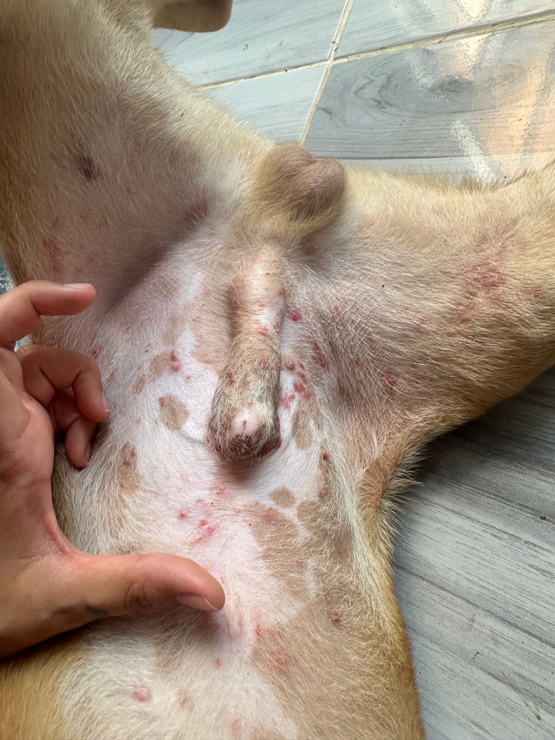 น้องหมาบีเกิ้ลมีผื่นขึ้นตามตัวตอนเเรกเป็นเล็กน้อย บริเวณท้องและรอบดวงตา พาไปหาหมอได้ยาฆ่าเชื้อกับยาแก้อักเสบ ผื่นคันเริ่มจางลง แต่พอยาเม็ดสุดท้ายหมด เช้าวันต่อมาน้องมีผื่นคันขึ้นเยอะกว่าเดิม