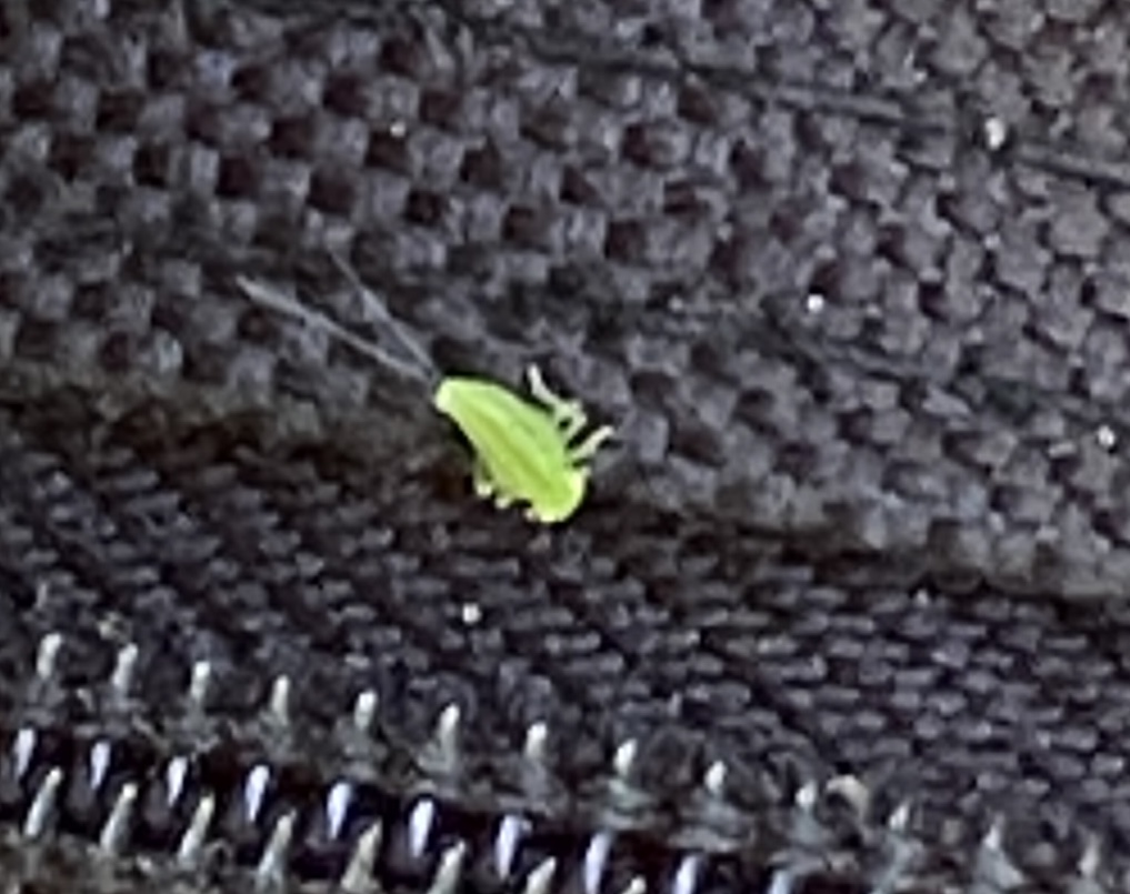 แมลงตัวสีเขียวเล็กๆกระโดดได้มีหางเล็กๆสีขาว