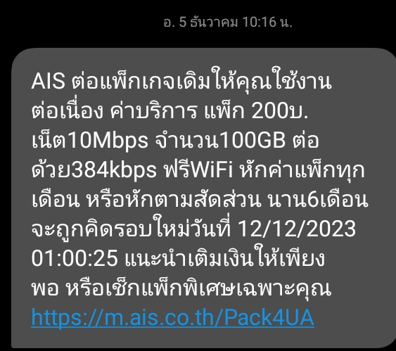 ขึ้นข้อความ ไม่สามารถตัดค่าแพ็ก200บ. ใช้เน็ต100GB(เร็ว15Mbps) โทรฟรี SWiFi 6M หรือตัดแพ็กตามสัดส่วน (100บ.ใช้ได้ 15วัน, 46.67บ.ใช้ได้ 7วัน)ได้ กรุณาเติมเงินให้เพียงพอ เพื่อใช้งานได้ต่อเนื่อง เเต่หลังจ