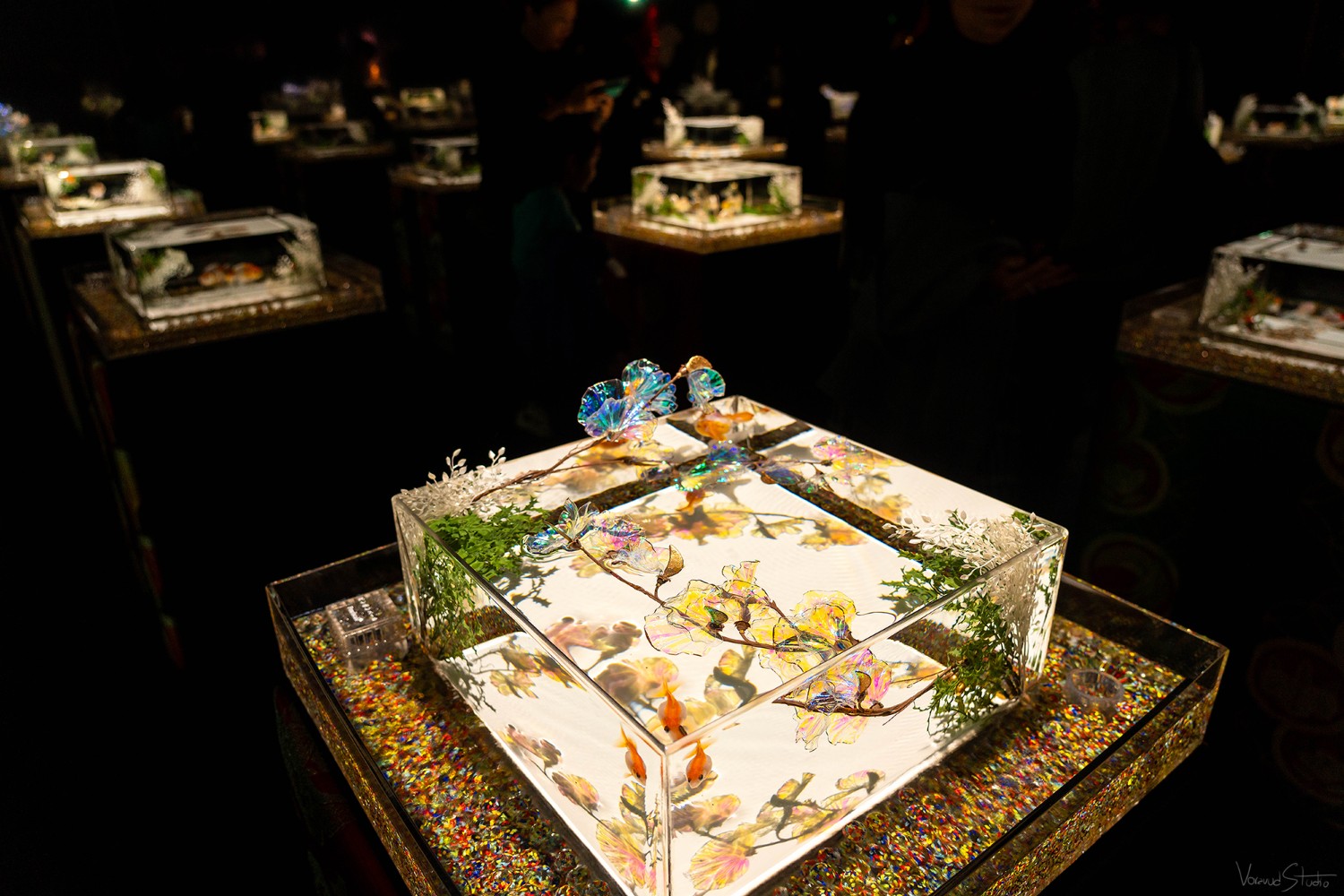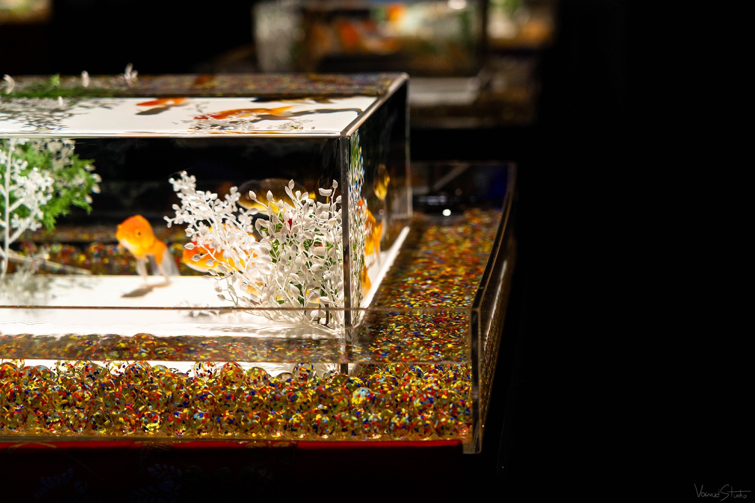 A Show of Kingyo ตู้ทรงสี่เหลี่ยมขนาดเล็ก ถูกวางไว้ตำกว่าระดับสายตา วางบนหินทรายให้ความรู้สึกหรูหรา เราสามารถมองเห็นเหล่าปลาทองแหวกว่ายได้จากด้านบน ตู้ถูกวางเรียงไว้จำนวนมากในพื้นที่ ให้ความรู้สึกไม่สิ้นสุด