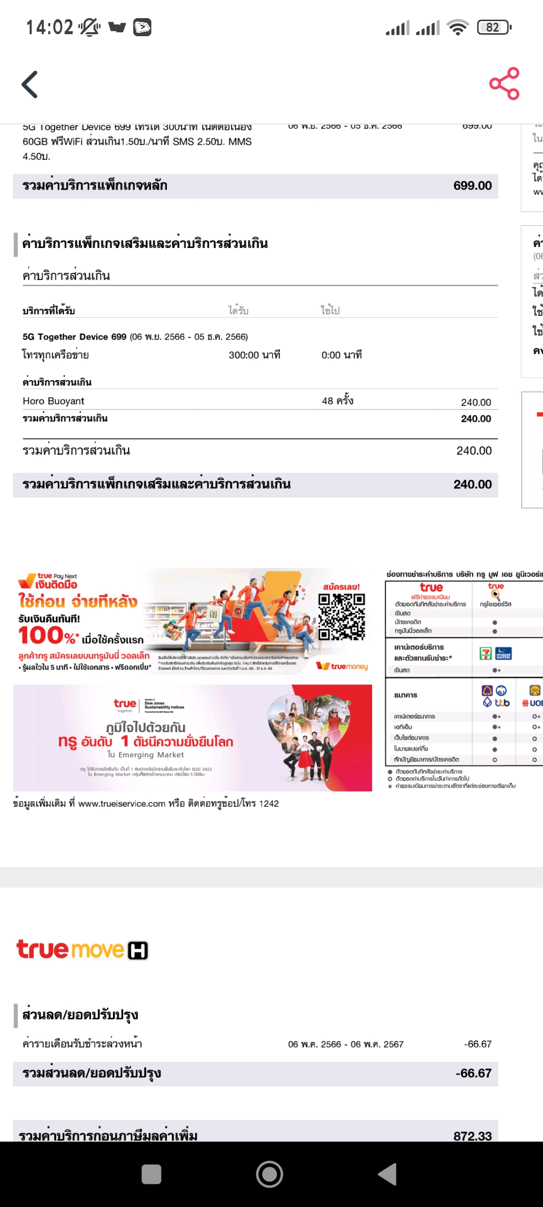 ตอนนี้ใช้ของทรูเป็นความเร็ว 1000/200 จริงๆโปรนี้ดีมากเพราะครบเลยทั้งเน็ตบ้านเน็ตมือถือ แต่อีกไม่กี่วันจะครบสัญญาพอดีและส่วนลดที่เคยได้ก็ต่อไม่ได้แล้วต้องจ่ายราคาเต็ม ตอนนี้อิจฉาลูกค้าใหม่ที่ได้โปรดีๆแ