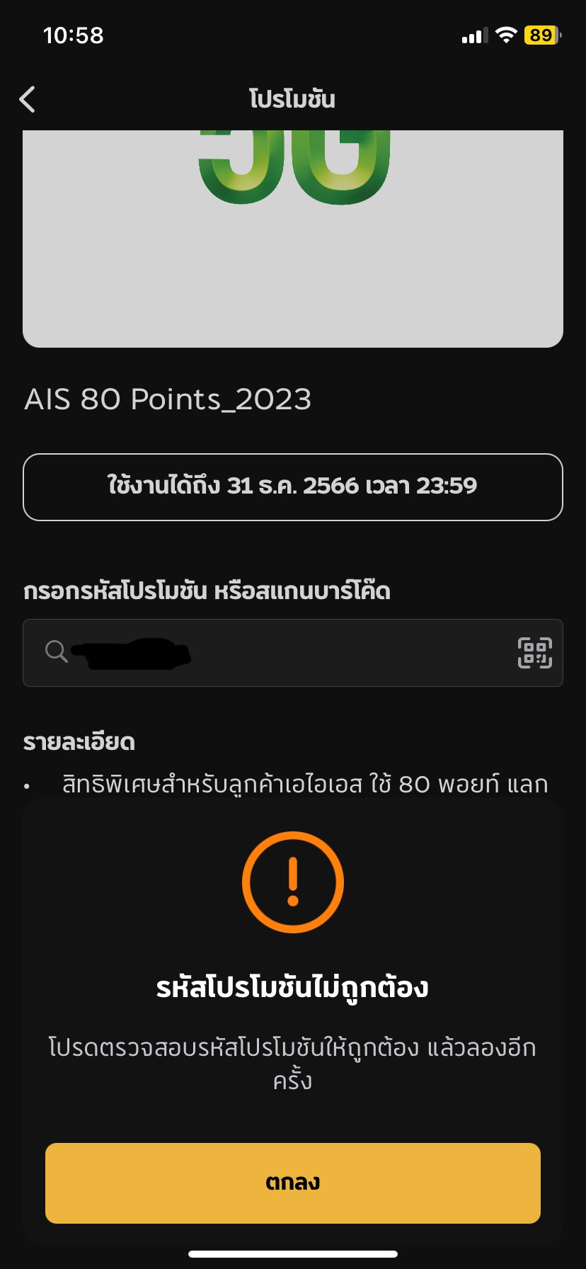 พอดีได้ทำการแลกพ้อย ais กับ ตั๋วหนัง จำนวน 100 พ้อยพอแลกไปแล้วมีเวลาให้ใช้โค้ด 10 นาที ทำยังไงก็ใช้ไม่ได้ มีใครเป็นบ้างคะ แก้ยังไงได้บ้างเสียพ้อยที่สะสมมาไปแล้วแต่ต้องมาเจอแบบนี้