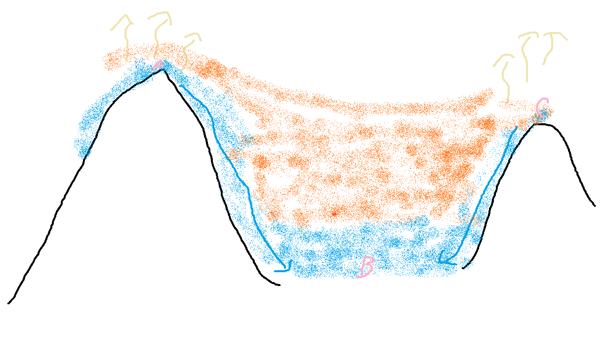 คราวนี้เมื่อเรารู้แล้วว่าอากาศผิวดินในคืนที่ท้องฟ้าแจ่มใสจะเย็นลง อากาศเย็นโมเลกุลอากาศจะเกาะกันแน่นกว่าทำให้อากาศเย็นมีน้ำหนักมากกว่าอากาศร้อน เช่น เวลาเราเปิดตู้เย็นอากาศเย็นจากตู้จะไหลลงไปที่เท้า ทำให้เรารู้สึกเย็นที่เท้า เช่นเดียวกันอากาศเย็นจากพื้นดินบนภูเขาสูงจะค่อยๆไหลลงมาตามหุบเขา พอเวลากลางคืนสัก 22:00 อากาศเย็นจะเริ่มสะสมตามแนวหุบเขา ทำให้บริเวณหุบเขามีอากาศเย็น และบางครั้งก็เย็นกว่ายอดเขาด้วย(ยิ่งถ้าลมนิ่ง ไม่มีเมฆ อากาศบริเวณหุบเขาจะเย็นกว่าด้วย และถ้าเย็นจนถึงระดับควบแน่น หุบเขาเหล่านั้นจะกลายเป็นทะเลหมอกนั่นเอง ทะเลหมอกจะเกิดขึ้นในวันที่อากาศเย็น ท้องฟ้าแจ่มใส อากาศนิ่งไม่มีลม)