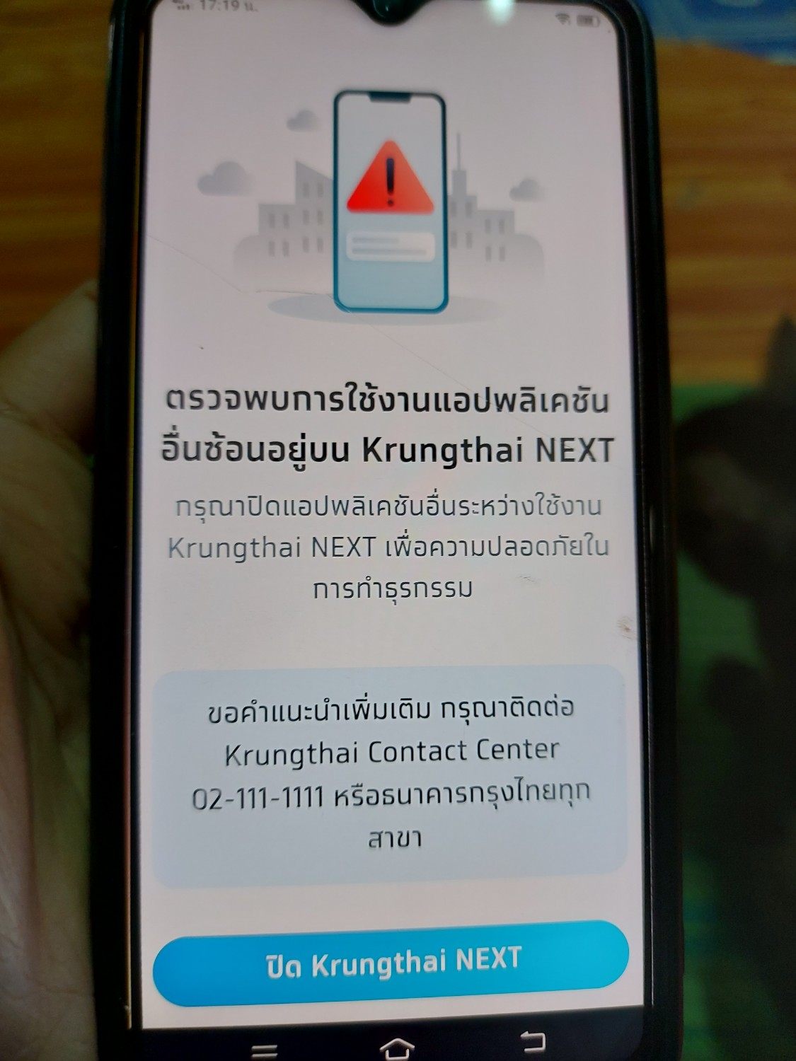 กดจะเข้าแอปธนาคารแต่มันขึ้นว่าตรวจสอลพบแอปพิเคชั่นซ้อนอยู่บนแอปกรุงไทยให้กดปิดแอปอย่างเดียวเลย