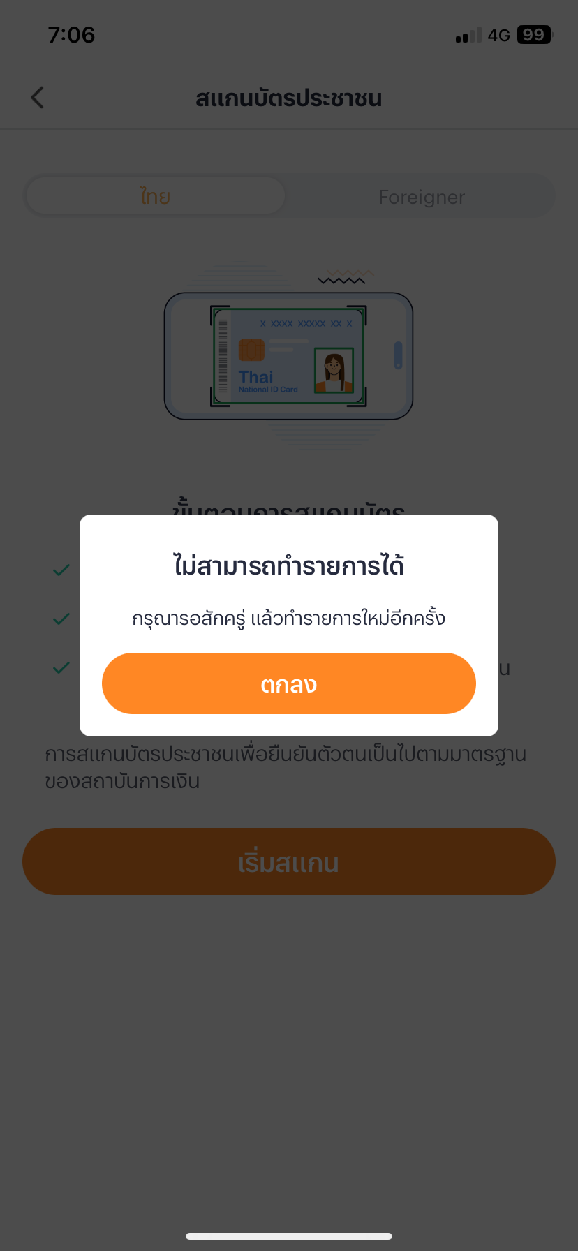 พอถึงหน้าขั้นตอนการสแกนบัตร ทางแอปพลิเคชันขึ้นข้อความว่า "ไม่สามารถทำรายการได้ กรุณารอสักครู่ แล้วทำรายการใหม่อีกครั้ง" ลบแอพลงใหม่ก็ไม่ได้ ลองสมัครอีกเครื่องก็สแกนไม่ได้ ไม่ทราบว่ามีทางแก้ไขยังไงบ้างคะ?
