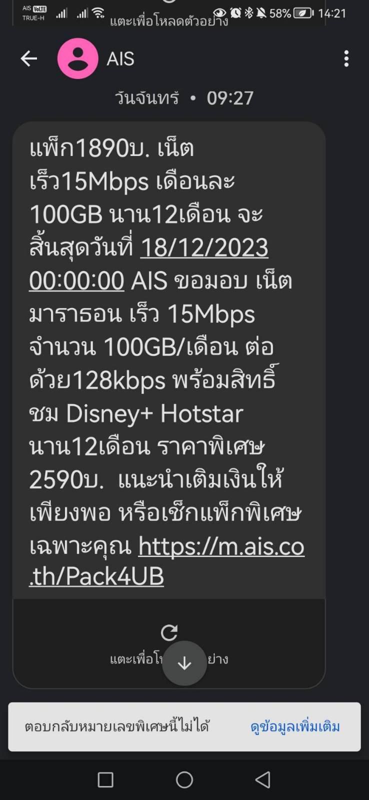ได้รับใบแจ้งหนี้มาค่ะ เกี่ยวกับค่าเน็ต ของAis ซึ่งเบอร์นี้ก่อนหน้าเติมเงินเน็ตรายวันปกติ แต่ที่วิทยาลัยมีคนมาจัดบูธ แล้วบอกให้ลองใช้แบบรายเดือน เดือนแรกฟรีไม่มีค่าบริการ แต่ผ่านไปไม่ถึงเดือนแจ้งเตือนใ