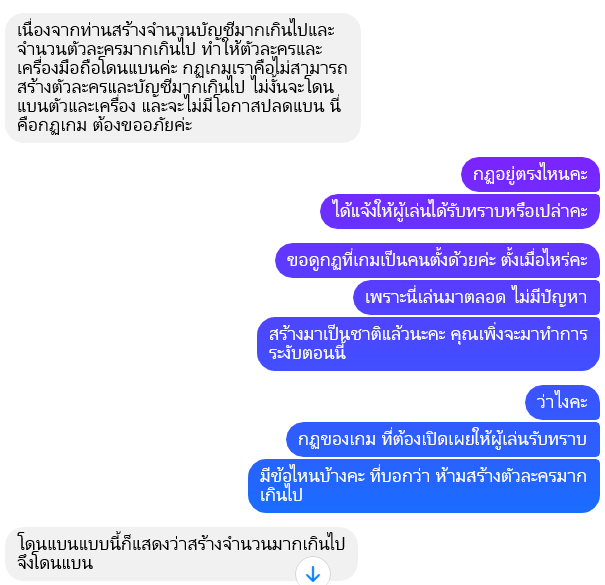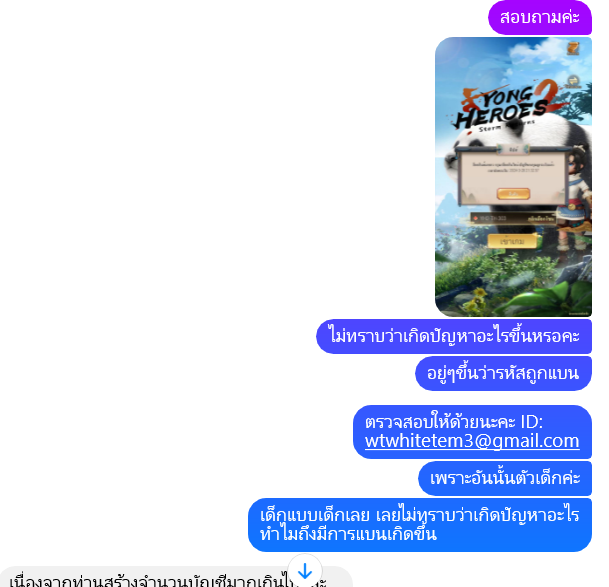 สวัสดีค่ะ ขออนุญาตเข้าเรื่องเลยนะคะ เนื่องด้วยจากดิฉันได้ทำการเล่นเกมออนไลน์ ชื่อเกม Yong Heroes 2 โดยได้ทำการเล่นมาเป็นระยะเวลาเดือนกว่าๆ แล้ว และด้วยที่ไม่ได้เป็นสายเติมเงิน แต่มีเครื่องมือถือให้เล่นประมาณ 2-3 เครื่อง จึงอาศัยสร้างหลายไอดี หลายตัวละคร และขยันฟามเอา แต่เกิดเรื่องวันนี้ 22.12.2023 ได้มีการระงับไอดีไม่ให้ดิฉันเข้าเกม จึงได้ทำการติดต่อสอบถามแอดมินของเกมไปว่าเกิดอะไรขึ้นกับไอดี คำตอบที่ได้รับกลับมาตามภาพเลยค่ะ ซึ่งเค้าแจ้งว่า มันเป็นกฏ (แต่เราถามว่ากฏอยู่ตรงไหน เค้าเลี่ยงที่จะไม่ตอบคำถามนั้น โดยที่เค้าเป็นคนตอบแบบนั้นมาก่อน)