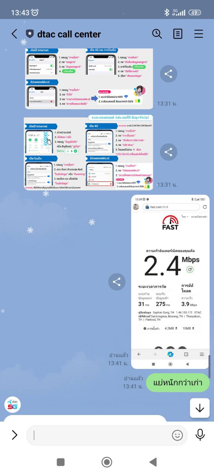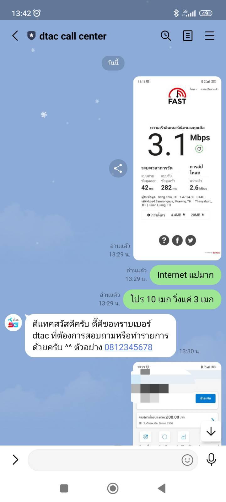 โปร 10 เมกไม่จำกัดรายเดือน 4g 5g วิ่งแค่ 3เมก เป็นลูกค้ามา 15 ปี ร้องไปในเฟส ไลน์ ก็ให้ AI ตอบ บอกแก้ไขอย่างไว บอทตอบตามที่เซ็ตไว้ แก้ไม่แก้ไม่รู้ ตอบไปก่อนว่าแก้แล้ว