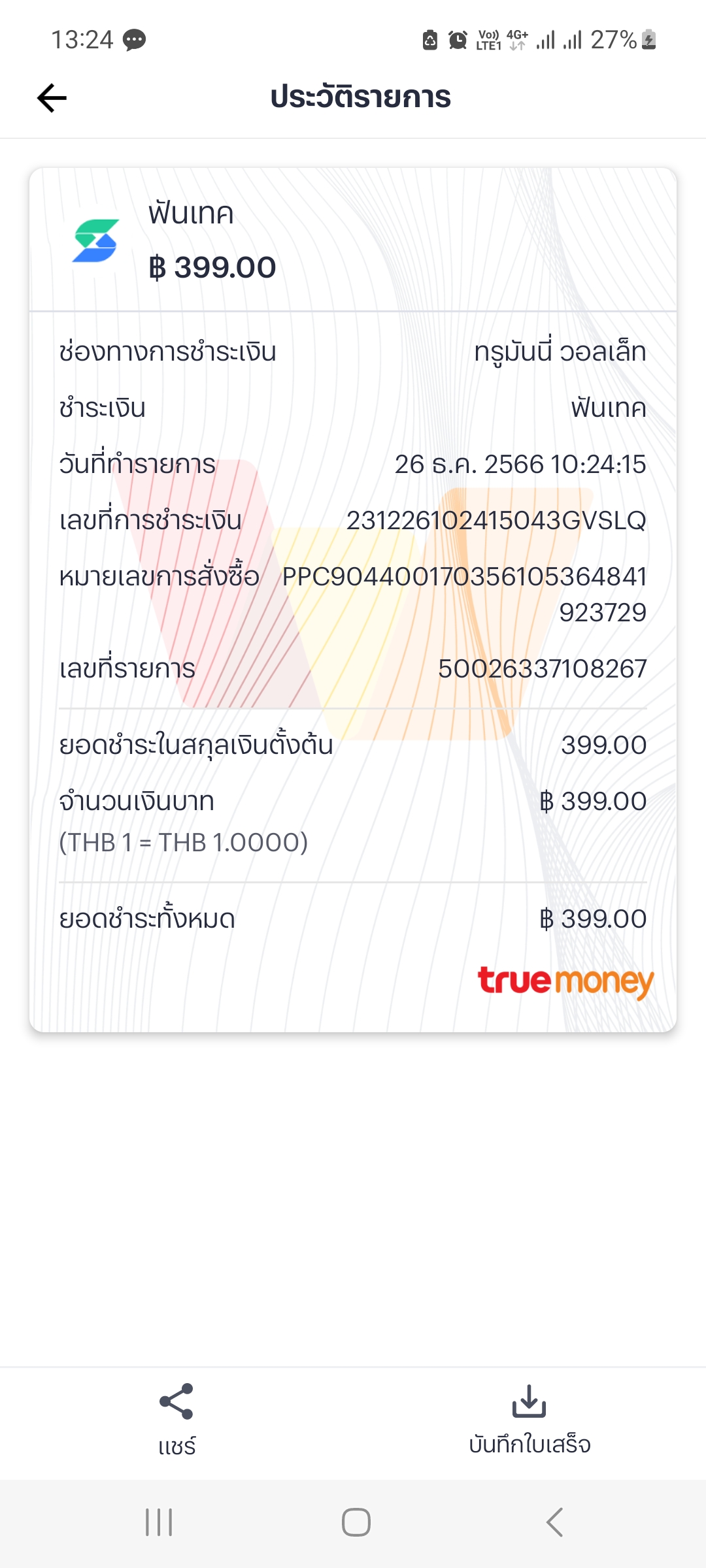 True wallet หักเงิน30 บาท ค่าอะไร