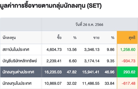 Sinthorn Summary 26/12/2566 : ต่างชาติซื้อสุทธิ 293.62 ลบ.