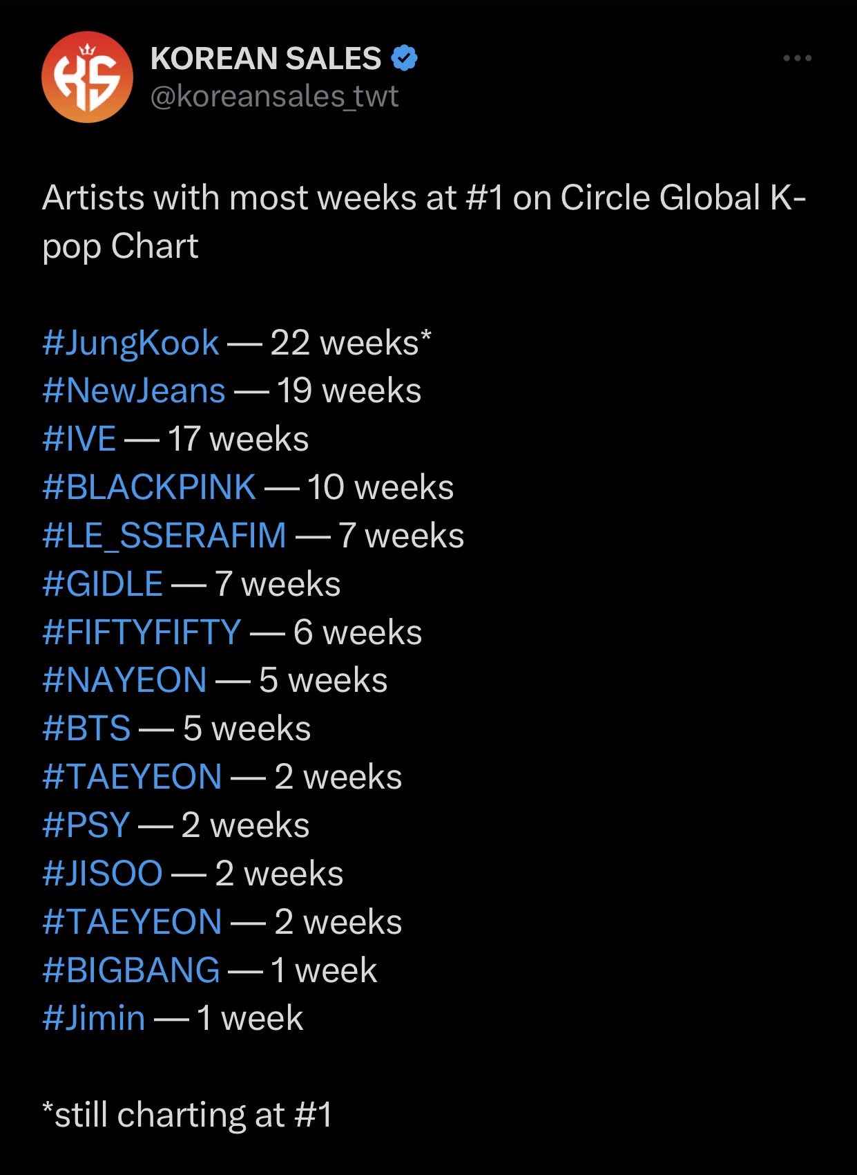 Jungkook สร้างสถิติ เป็นศิลปินที่อยู่อันดับ #1 บน Circle Global K-Pop Chart ได้ยาวนานที่สุด 22 สัปดาห์แล้ว