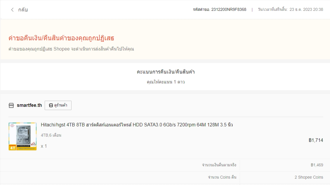 - ร้านสินค้าที่ราคาไม่แพงยอมรับการคืนเงิน แต่ได้รับสินค้า Harddisk ไป (ทักไปไม่ตอบคงไม่พอใจที่คืนสินค้า)