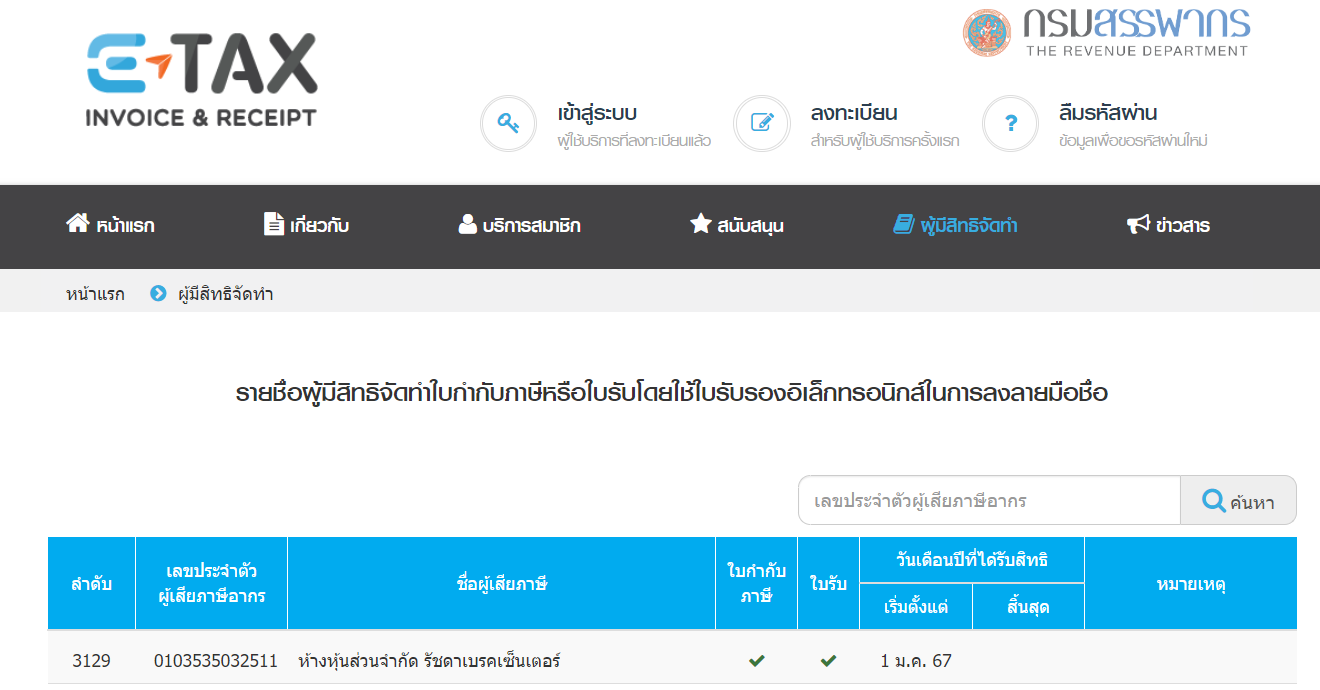นำเลขผู้เสียภาษีอากรไปค้นหา ที่ https://etax.rd.go.th/etax_staticpage/app/#/index/registered#top
