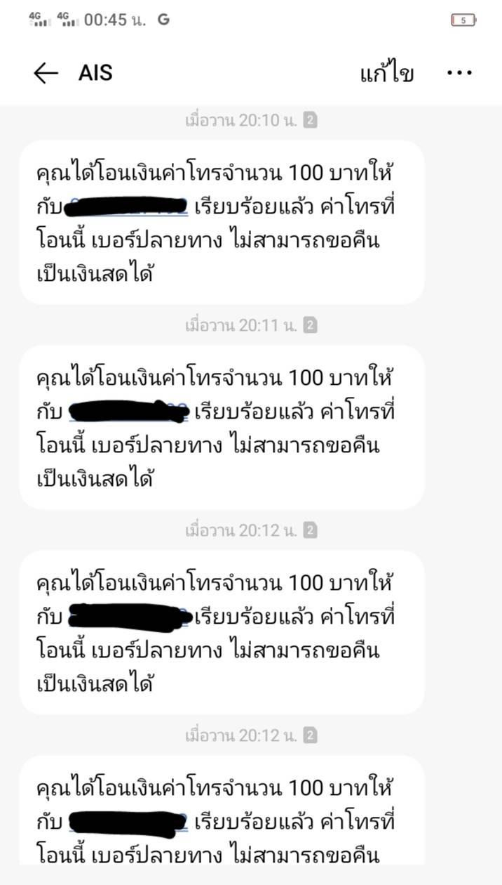 เบอร์ 065-xxx-xxxx โอนเงินให้เบอร์ 063-xxx-xxxx จำนวน 590 บ. รอบละ 100 บ. และรอบสุดท้าย 90 บ. แต่เงินเข้าแค่ 500 และขาด90 บ. ยอดไม่ครบค่ะ โอนเงินเข้าระบบอีกเบอร์ 6 รอบเข้า แค่ 5 รอบค่ะ อีกรอบไม่เข้าค่า เบอร์ต้นทางขึ้น sms ว่าโอนแล้วแต่เบอร์ปลายทาง ไม่ขึ้น sms ไม่มีขึ้นว่า ยอด 90 บ.เข้ามา กรณีนี้ ais จะแก้ปัญหายังไงได้บ้าง เงินรอบที่ 6 โอนเข้าระบบกี่โมง 😡