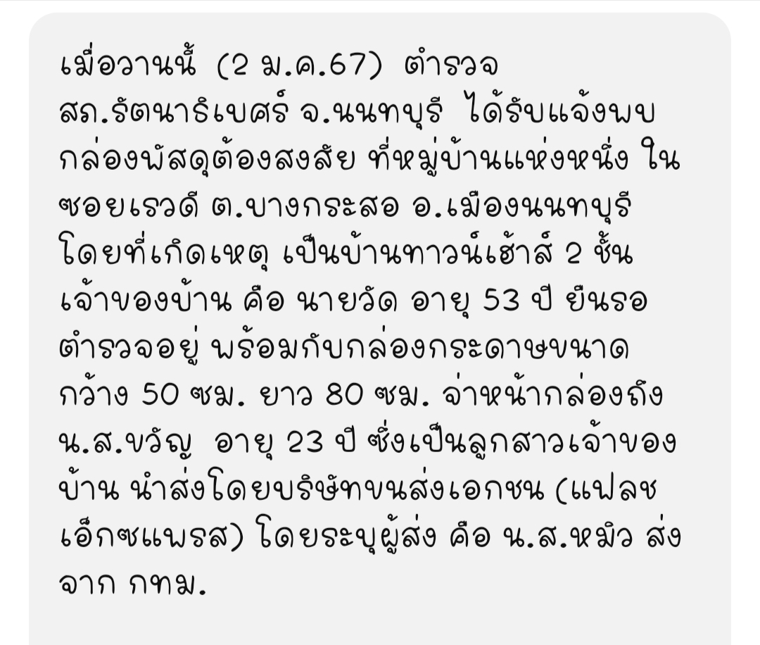 เนื่องด้วยผมสั่งของจากในกลุ่มไลน์ จัด ems ส่งทางไปรษณีย์ เเต่เมื่อวันศุกร์พัสดุได้ถูกจัดส่งสำเร็จ เมื่อวันที่ 15 สิงหาคม 2025 เวลา 13.25น ซึ่งผมเลิกงานเเล้วกลับเข้าห้องเวลา 22.30น ก็จะตรวจดูพัสดุที่มา