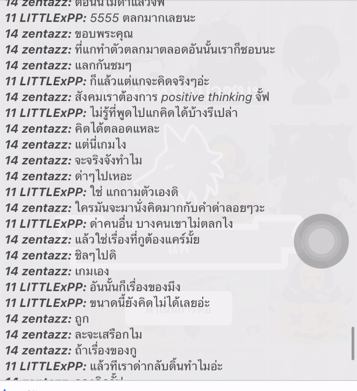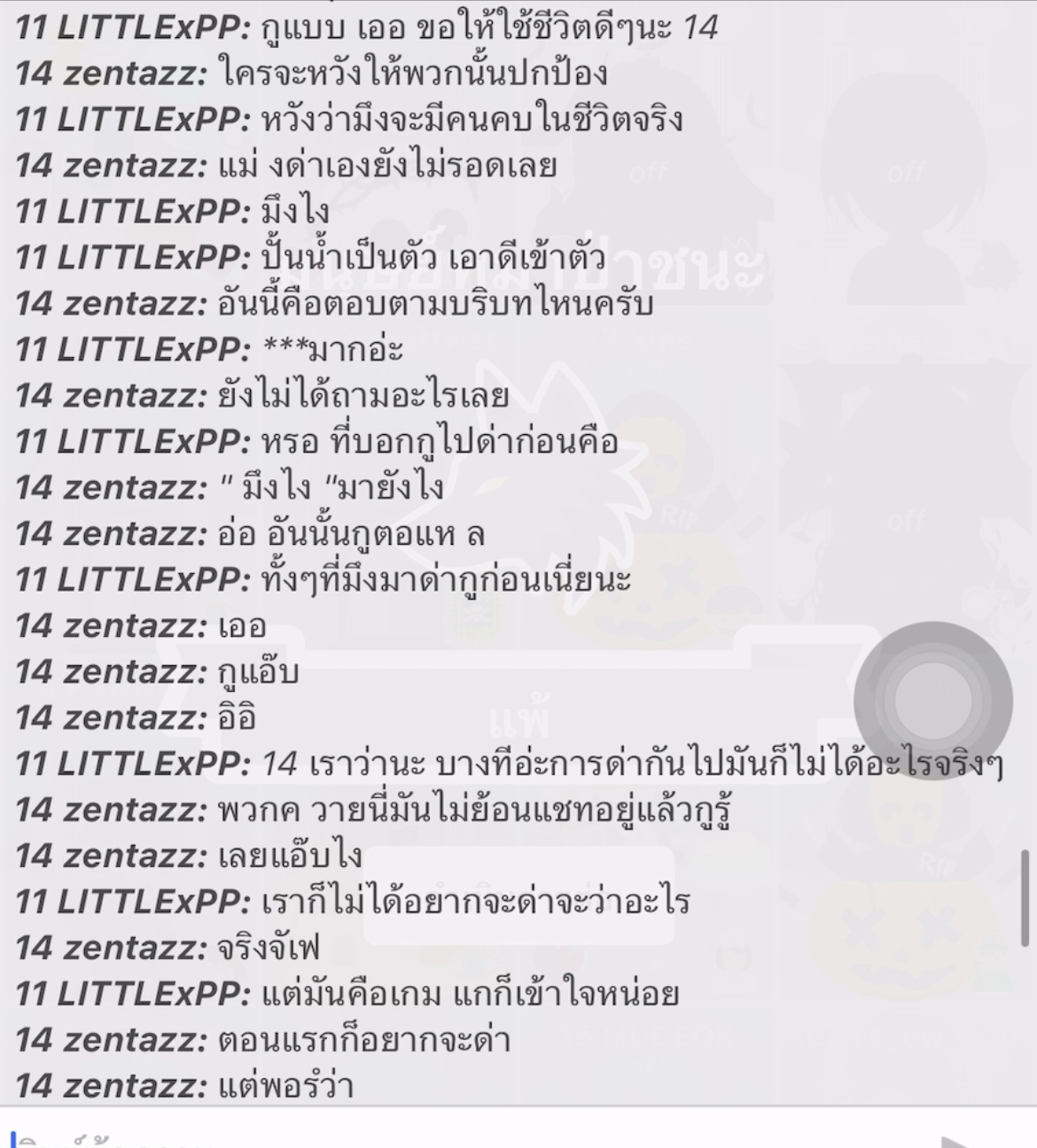 สุดท้ายนี้ เราเข้าใจสังคมเกม แต่ทำไมต้องถึงขนาดนี้ เราผิดอะไรมากหรอคะ เรื่องด่าเราก็เป็นคนนึงที่มีอารมณ์ร้อน จริงๆอยากขอโทษเขาด้วยซ้ำ แต่เขาไม่รู้สึกผิดเลย เราขอโทษไม่ลงจริงๆค่ะ ไม่เข้าใจแค่เรามองผิดบทบาท เราถึงกับต้องเจอขนาดนี้ ใครโอเค เราไม่รู้ แต่เราไม่โอเคจริงๆค่ะ