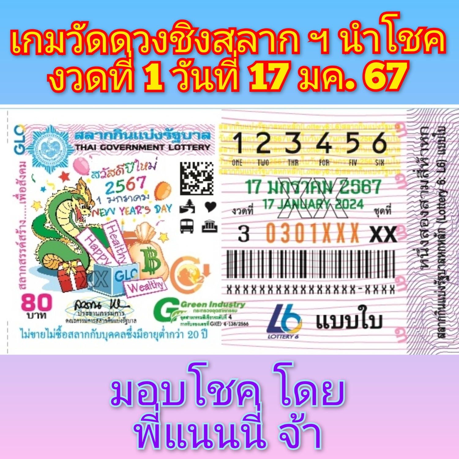 รางวัล :- สลาก ฯ นำโชค งวดที่ 1 วันที่ 17 มกราคม 2567 จำนวน 2 รางวัล ๆ ละ 3 ใบ จ้า