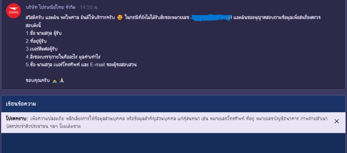 สวัสดีค่ะเพื่อนๆ อยากสอบถามเพื่อนๆค่ะ คือเรารอพัสดุดุอยู่ค่ะ ทางผู้ส่ง ส่งมารอบแรกแบบลงทะเบียน ปรากฎว่าพัสดุหายค่ะ ทางผู้ส่งเค้าเลยส่งมาให้ใหม่เป็นแบบ EMS ตั้งแต่วันที่ 4 ค่ะ พัสดุมาถึงปลายทางตั้งแต่วันที่ 6 แล้วค่ะ แต่ไม่อัพเดทไปไหนเลย วนไปวนมาอยู่ที่เดิม เราเลยลองทักหลังไมค์ไป คือเราสงสัยว่า แค่ตามพัสดุต้องให้ข้อมูลหมดขนาดนี้เลยหรอคะ ปกติไม่ค่อยได้ส่งไปรษณีย์เท่าไรเลย