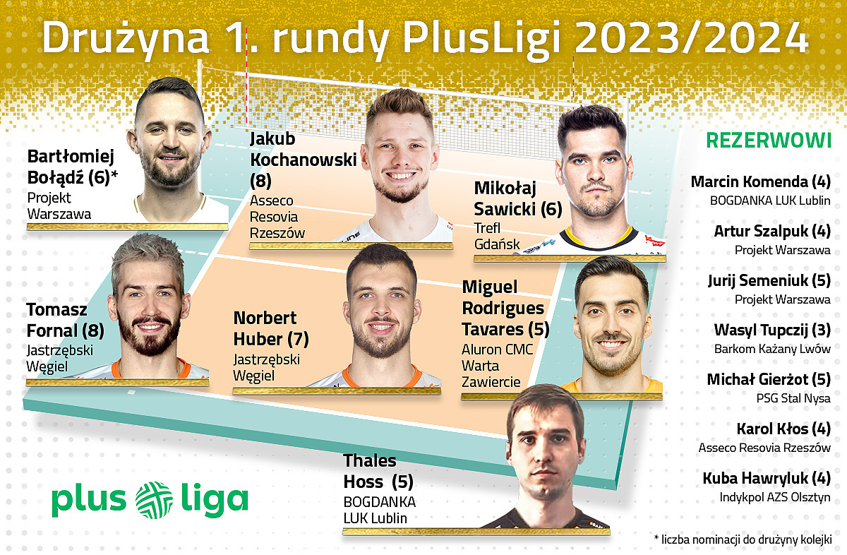 เปิดสถิติรอบแรกของ PlusLiga 2023/24 Dream team leg 1Dream team leg 2 Top 5 Best MVPhttps://www.plusliga.pl/statsRanking/type/MvpRanking/tournament_1/44.html Top