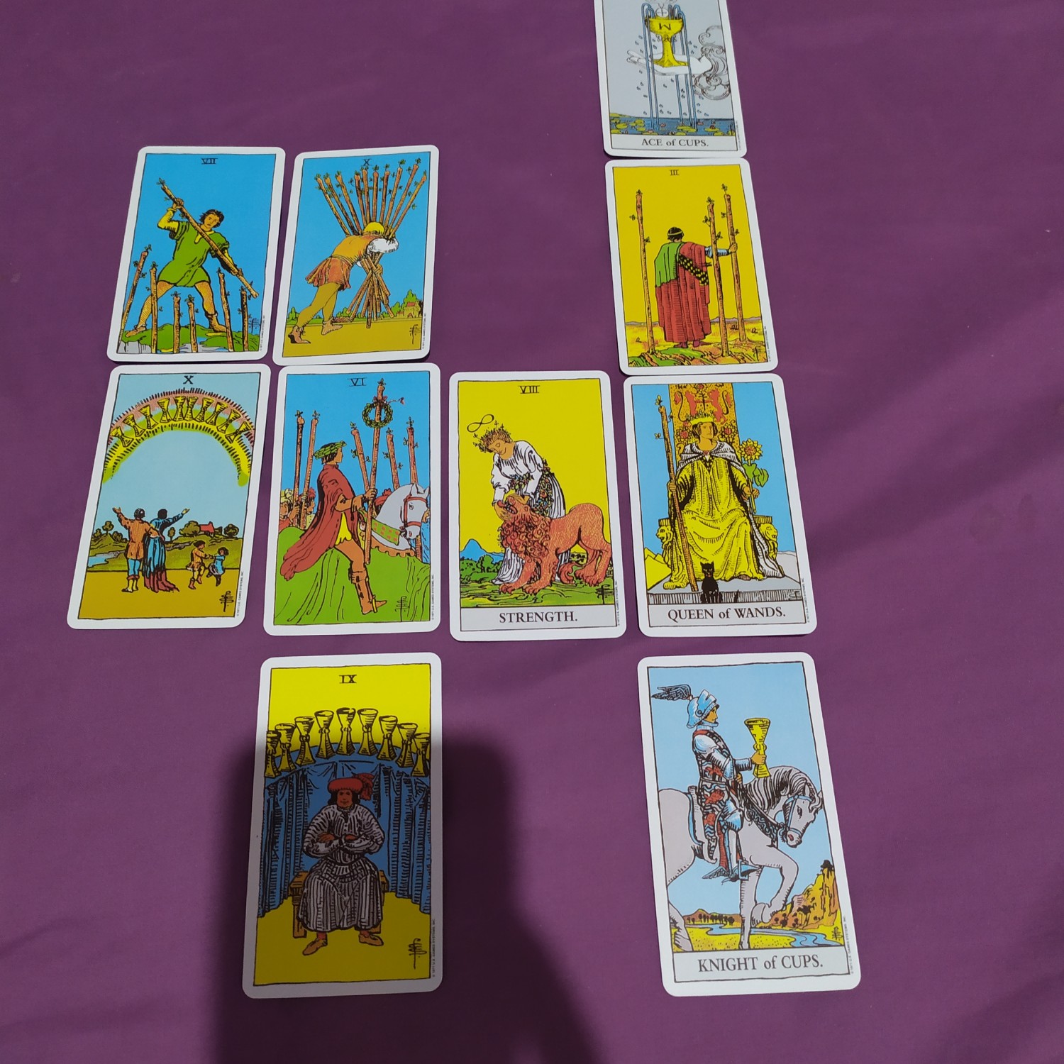 1. The Tower 2. The Chariot 3. THE NINE OF WANDS 4. FIVE OF SWORDS 5. The Fool 6. THE PAGE OF SWORDS 7.THE QUEEN OF WANDS 8.THE QUEEN OF SWORDS 9. The Devil 10. ACE