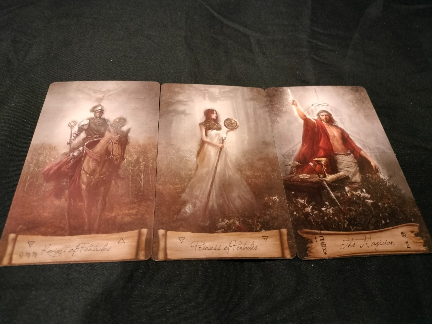จับ 3 ใบได้ Queen of wand, Knight of wands และ King of pentacles เรียงไปค่ะ แล้วก็ถามว่าเขาชอบเราไหม จับได้ The devil, The magician กับ Knight of pentacles ค่ะ