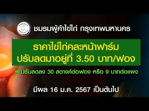 จึงขอปรับราคาไข่ไก่ อยู่ที่ 3.50 บาท/ฟอง หรือ ลดลงไปแผงละ 9 บาท โดยมีผลตั้งแต่วันที่ 16 มกราคม 2567 เป็นต้นไป จนกว่าสถานการณ์จะคลี่คลายอย่างชัดเจน และทั่วถึง