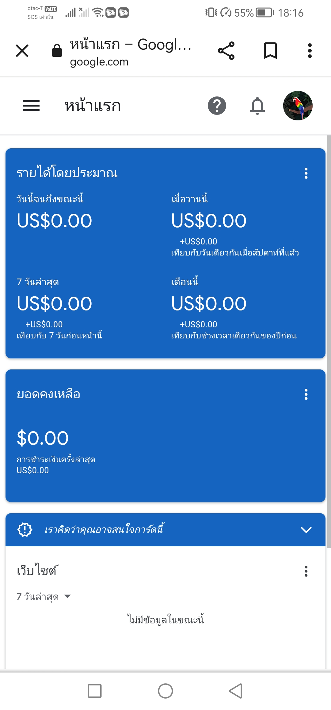 ค่ะมันทำไมไม่มีเหรี่ยญสักหน่อยเลยค่ะผิดพลาดตรงไหนเนี้ย..น่าจะมีสักหน่อยนี่ไม่เลยค่า งง. เปรียบเทียบของเพื่อนเขาขึ้นดีจัง..เรานิ่งเฉยเลยจ้าเปิดGoogle. Adsenseเจอแบบเศร้าเลยค่า