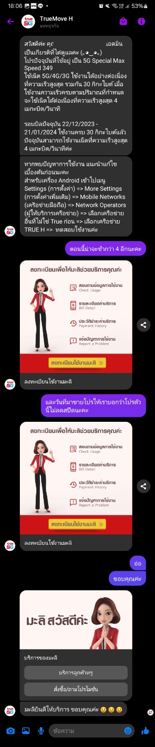 ก่อนหน้านี้เราใช้เน็ตไม่ลดสปีดโปรรายเดือน แต่ช่วงนี้รู้สึกเน็ตช้าผิดปกติ แค่จะทำสปีดเทสยังทำไม่ได้ เลยลองทักไปถามทรูดูและได้คำตอบแบบนี้ พอจะสอบถามเพิ่มเติมก็จะให้ไปคุยกับบอทอย่างเดียวเลย เรายอมจ่ายแพงเพื่อเน็ตไม่ลดสปีดเพราะรู้ว่าเราใช้เน็ตเยอะแต่เจอแบบนี้ก็ไม่ไหวมั้งคะ ทุกคนเจอเหมือนกันมั้ยคะ