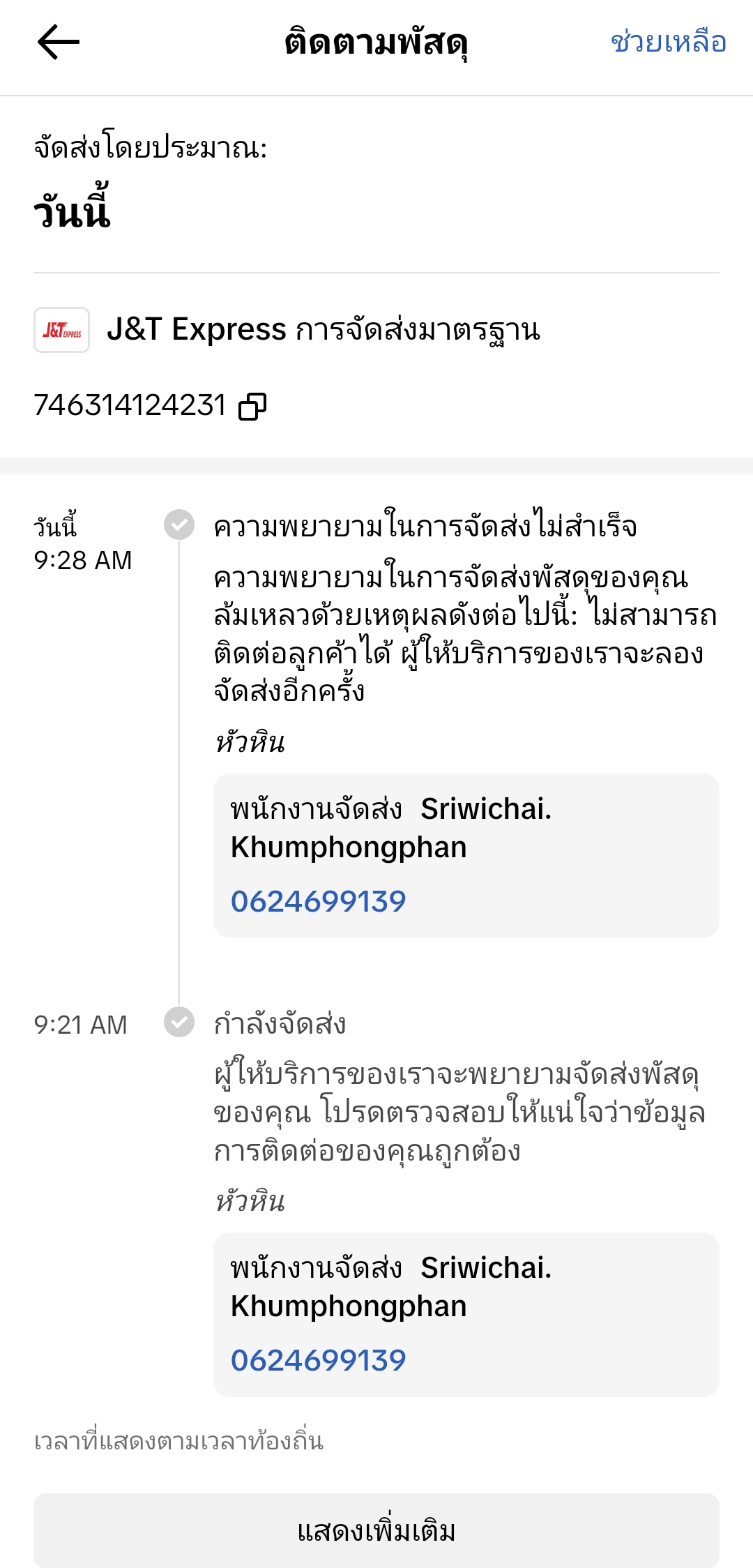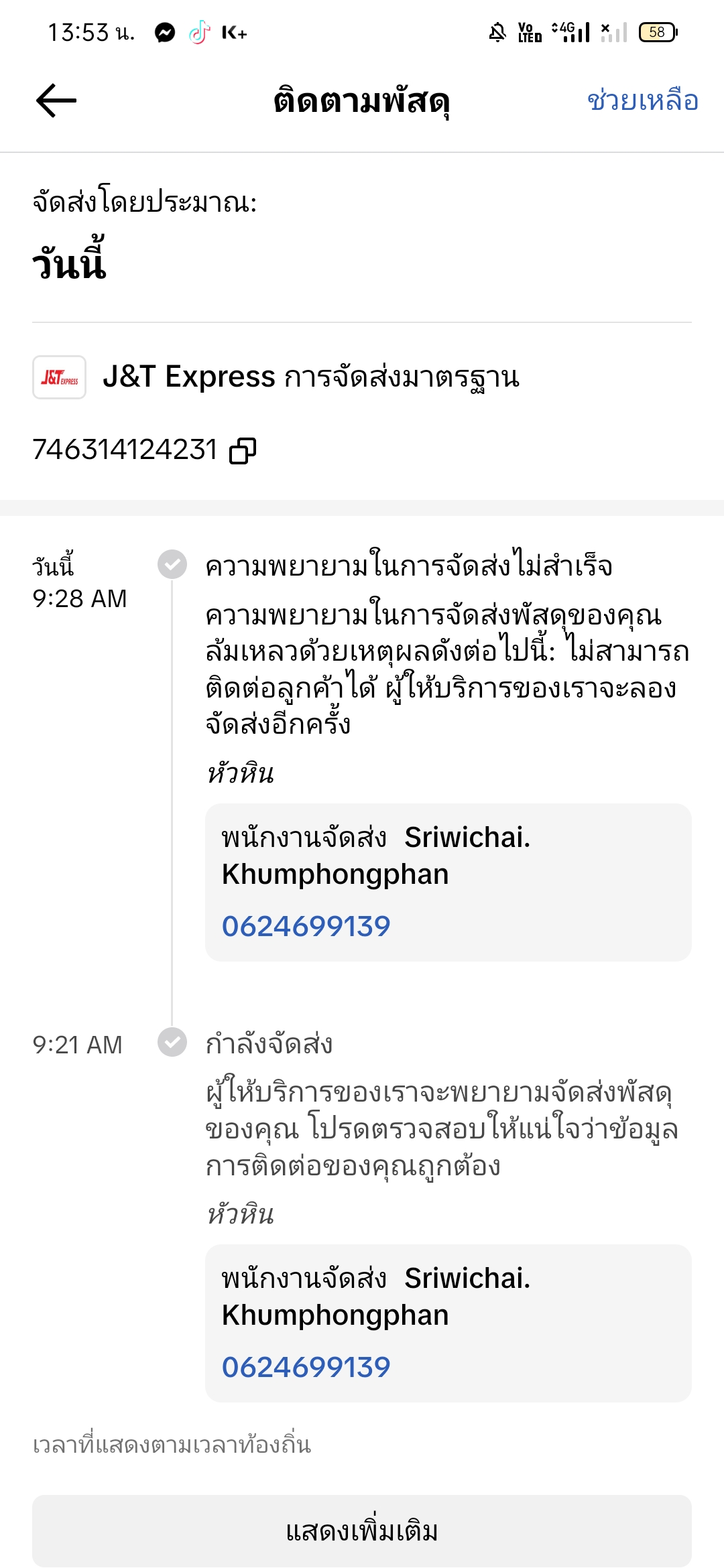 ไม่ได้รับสายJ&T กลัวของตีกลับมากครับ เลขพัสดุ746314124231 ช่วยหน่อยนะครับ